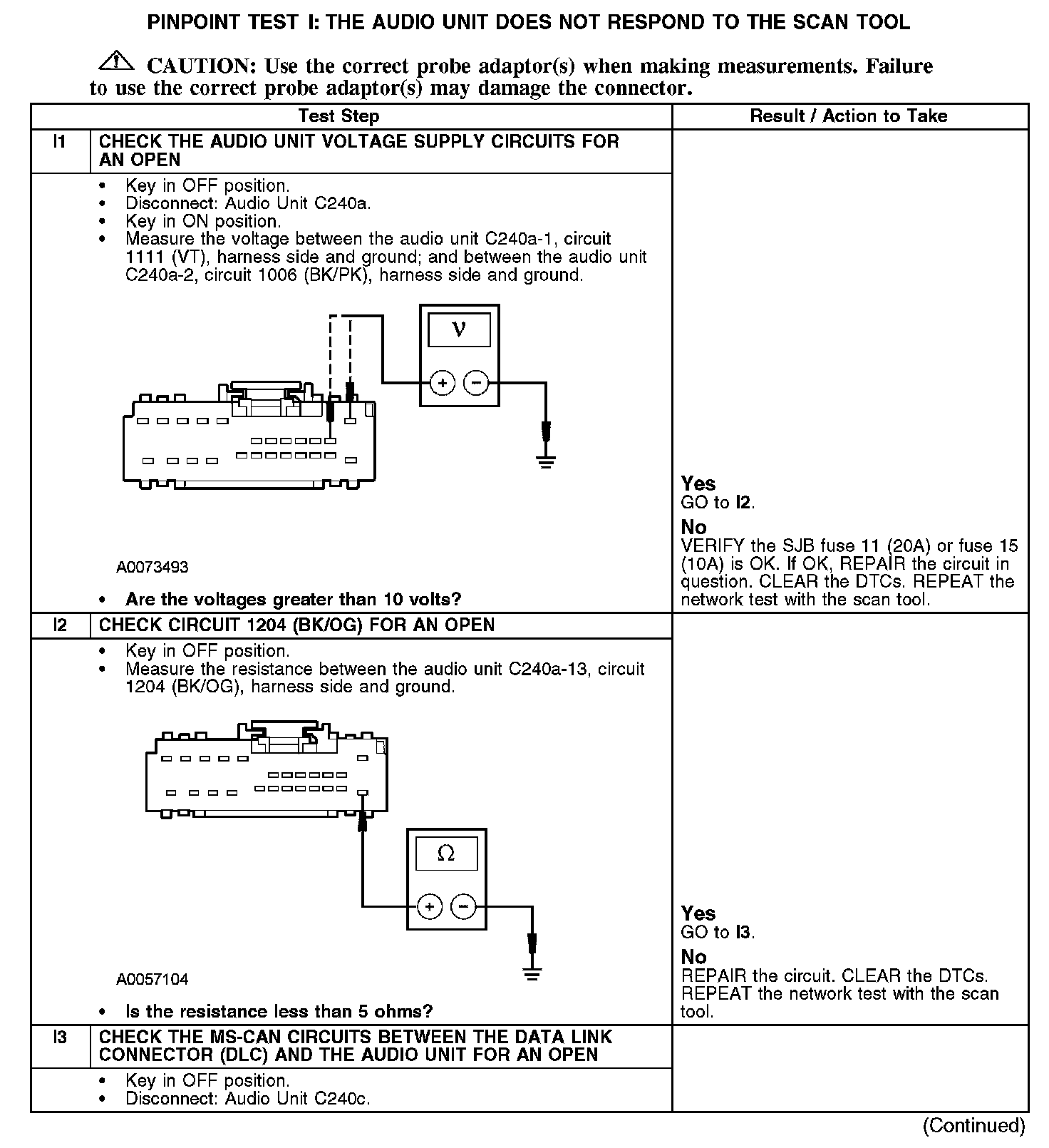 The audio unit communicates with the scan tool through the medium speed controller area network (MS-CAN). Circuits 2180 (WH/BK) (MS-CAN +) and 2181 (BK/YE) (MS-CAN -) provide the network connection to the audio unit. The audio unit shares the MS-CAN network with the smart junction box (SJB), the driver seat module (DSM), the electronic automatic temperature control (EATC) module, the digital versatile disc (DVD) player, the satellite radio receiver, and the instrument cluster. Voltage for the audio unit is provided by circuits 1006 (BK/PK) and 1111 (VT). Circuit 1204 (BK/OG) provides ground.