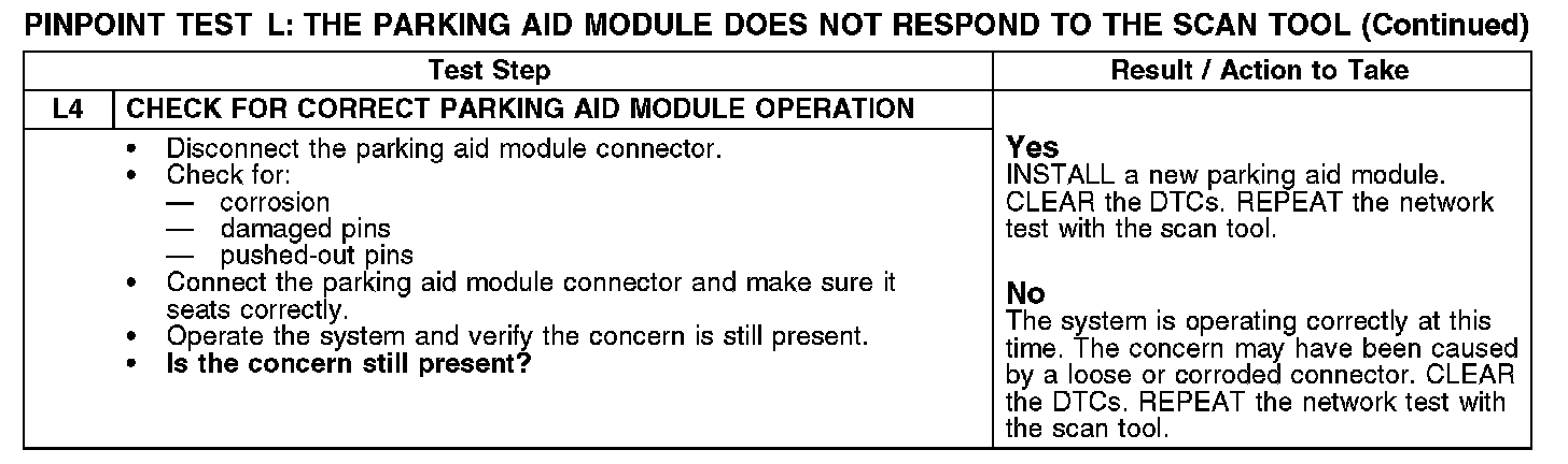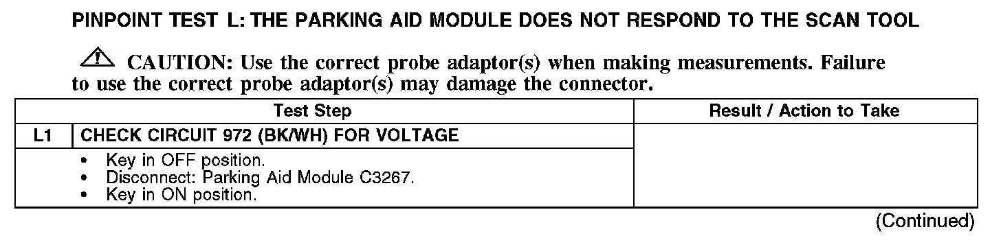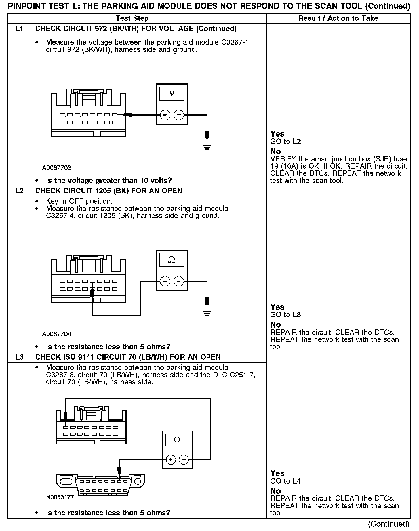The parking aid module communicates with the scan tool through the ISO 9141 communications network, circuit 70 (LB/WH). Voltage for the parking aid module is provided by circuit 972 (BK/WH). Ground is provided by circuit 1205 (BK).