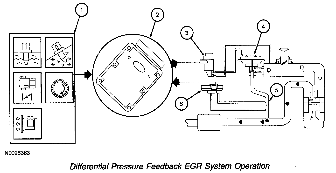 6. The differential pressure feedback EGR sensor measures the actual pressure drop across the metering orifice and relays a proportional voltage signal (0 to 5 volts) to the PCM. The PCM uses this feedback signal to correct for any errors in achieving the desired EGR flow.