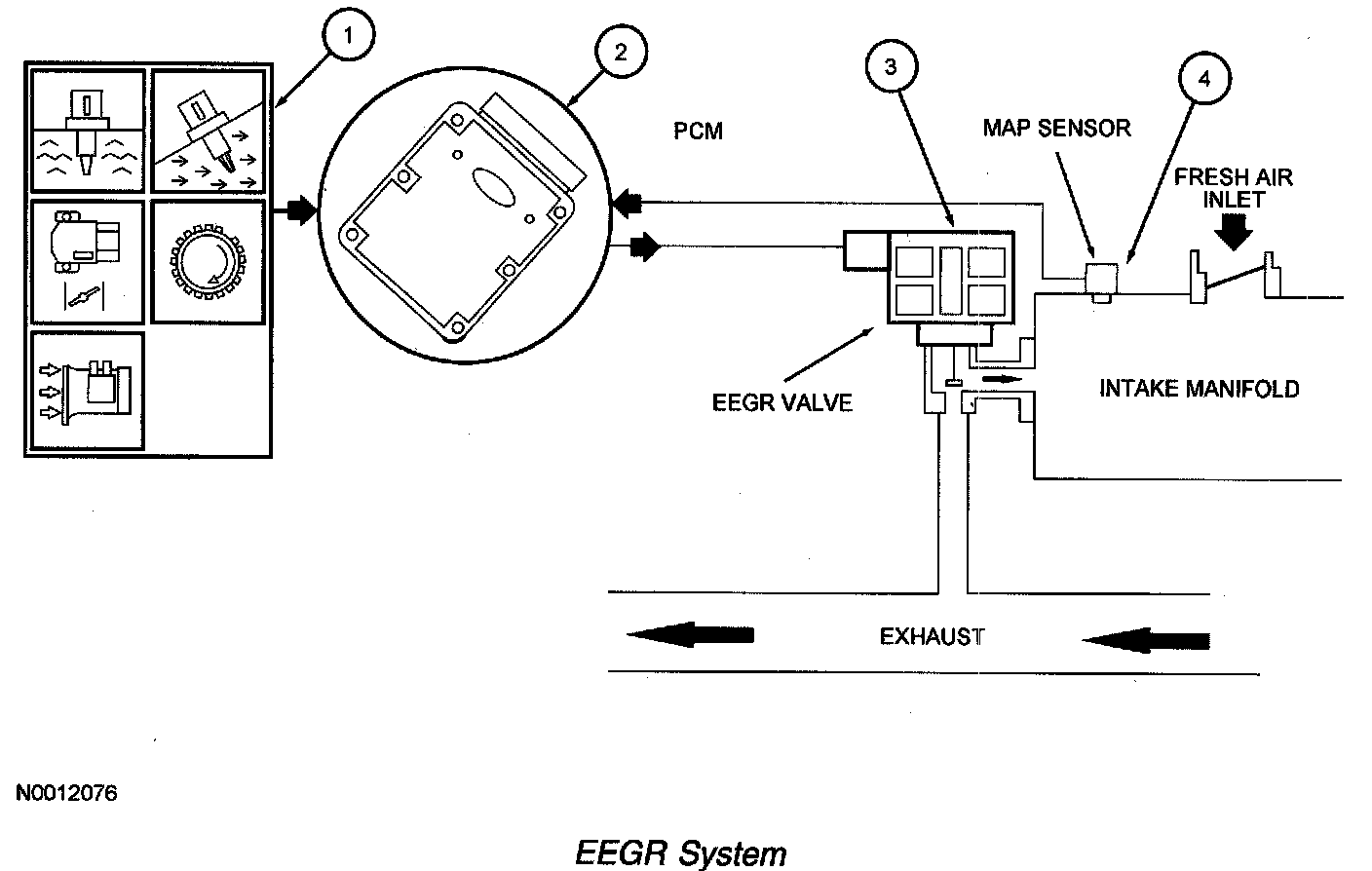 The EEGR system consists of an electric motor/EGR valve integrated assembly, a PCM, and connecting wiring. Additionally a manifold absolute pressure (MAP) sensor is also required. Operation of the system is as follows: