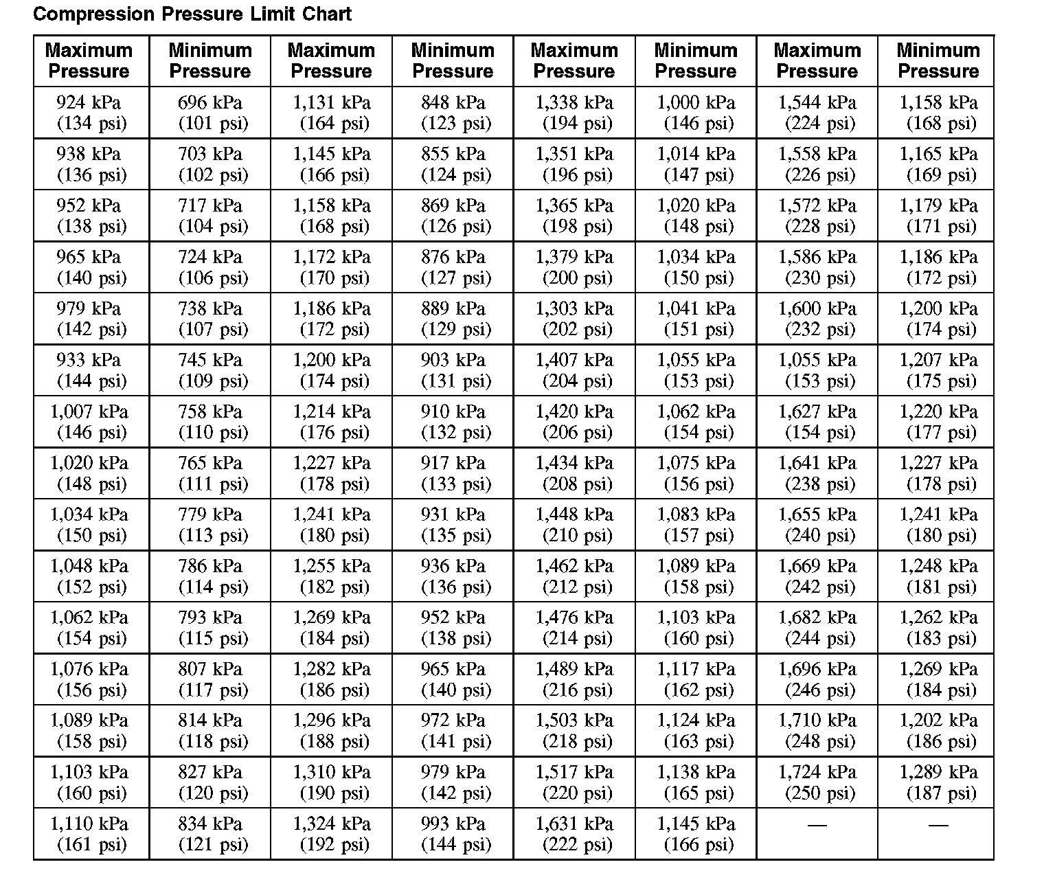 The indicated compression pressures are considered within specification if the lowest reading cylinder is at least 75 percent of the highest reading. For additional information, refer to the Compression Pressure Limit Chart.