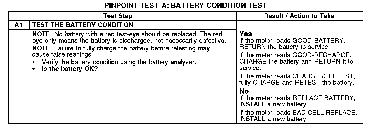 Battery condition is determined by measuring battery terminal voltage after a specific discharge current is applied for a specified time period.