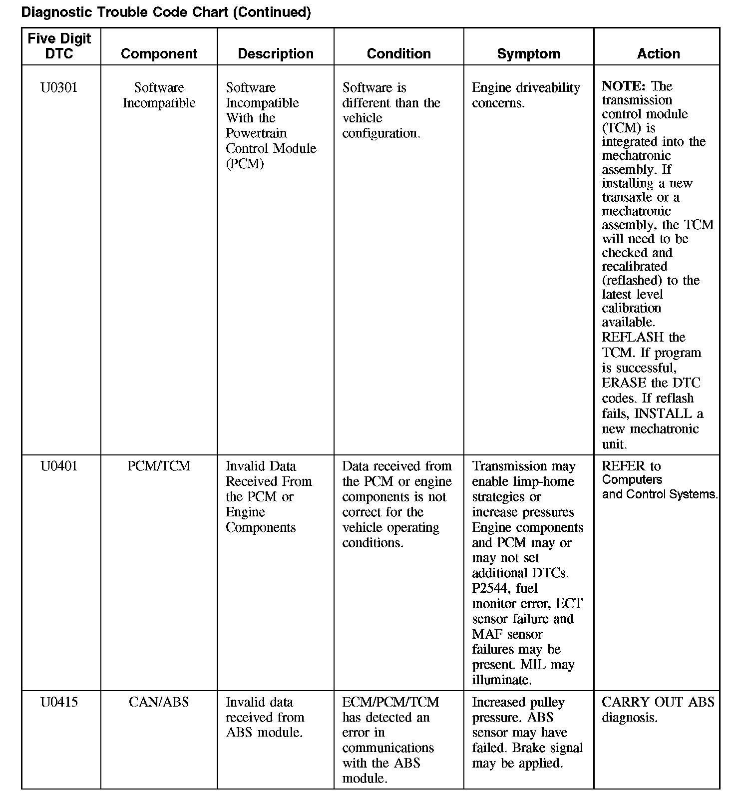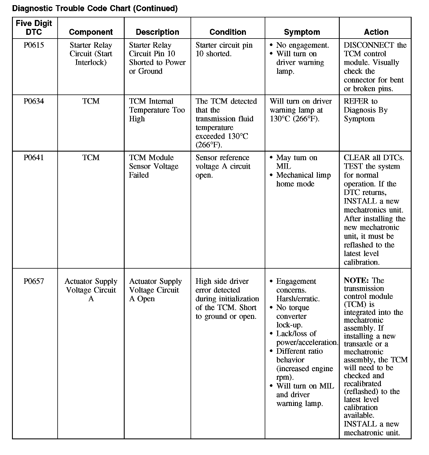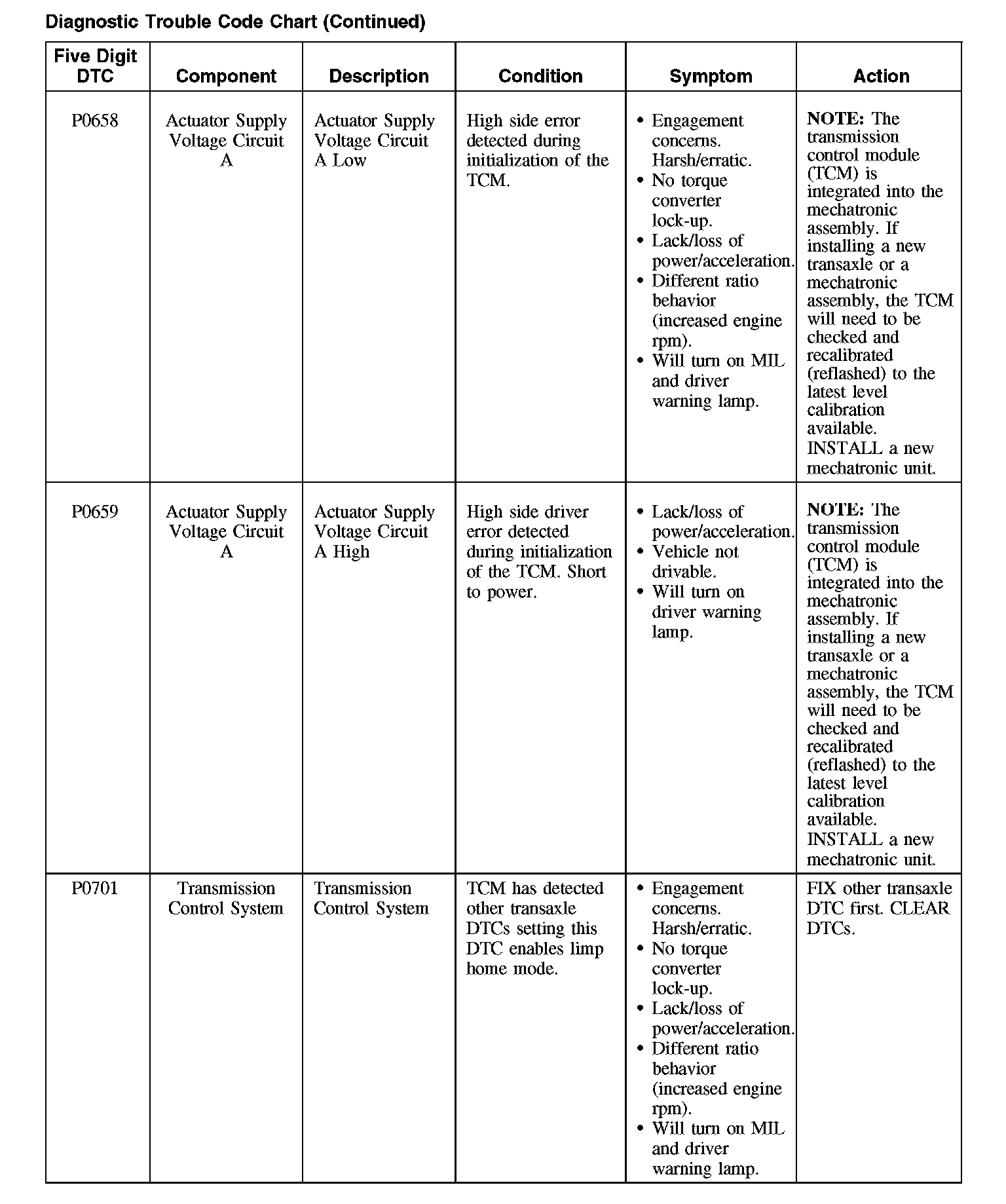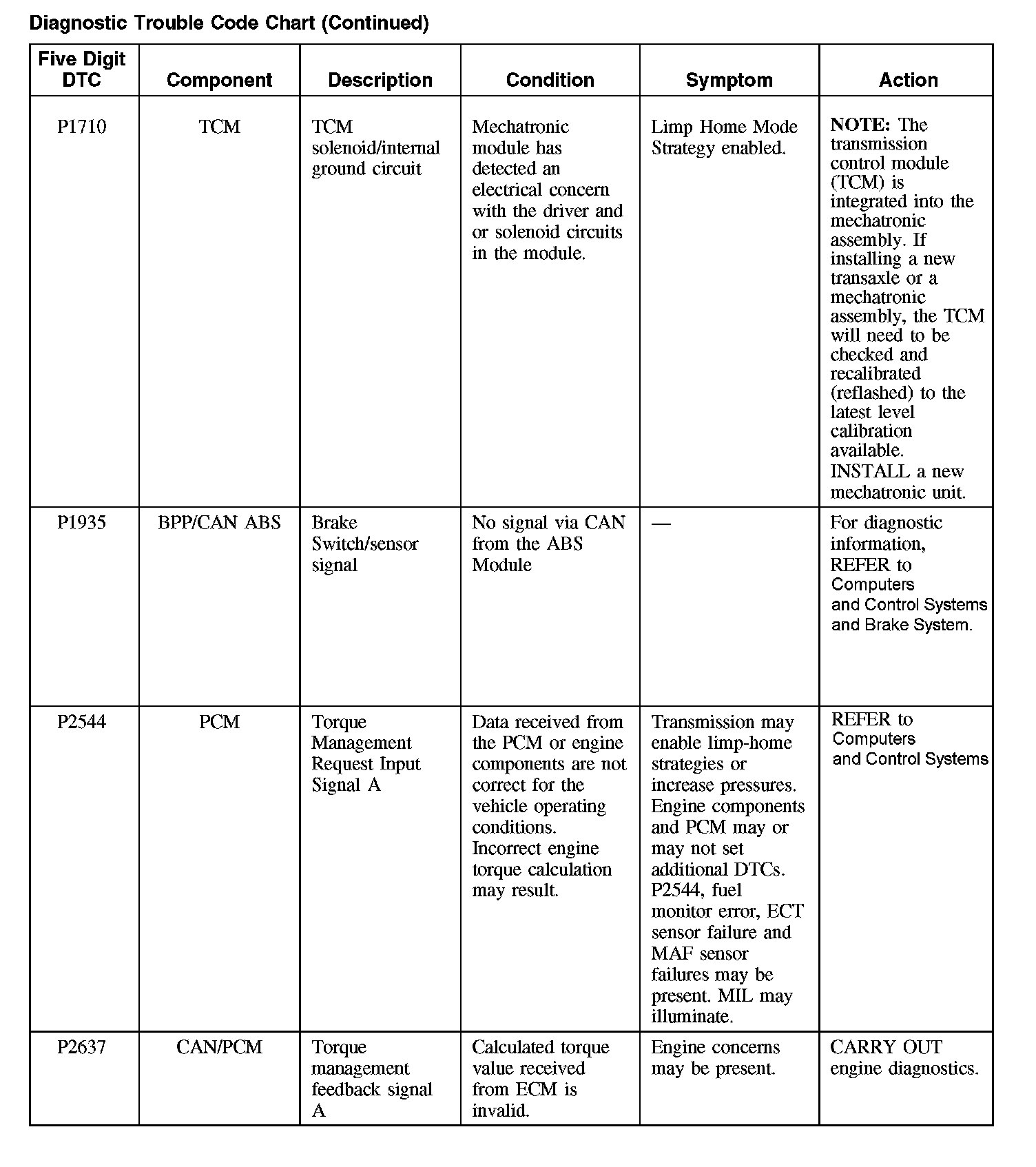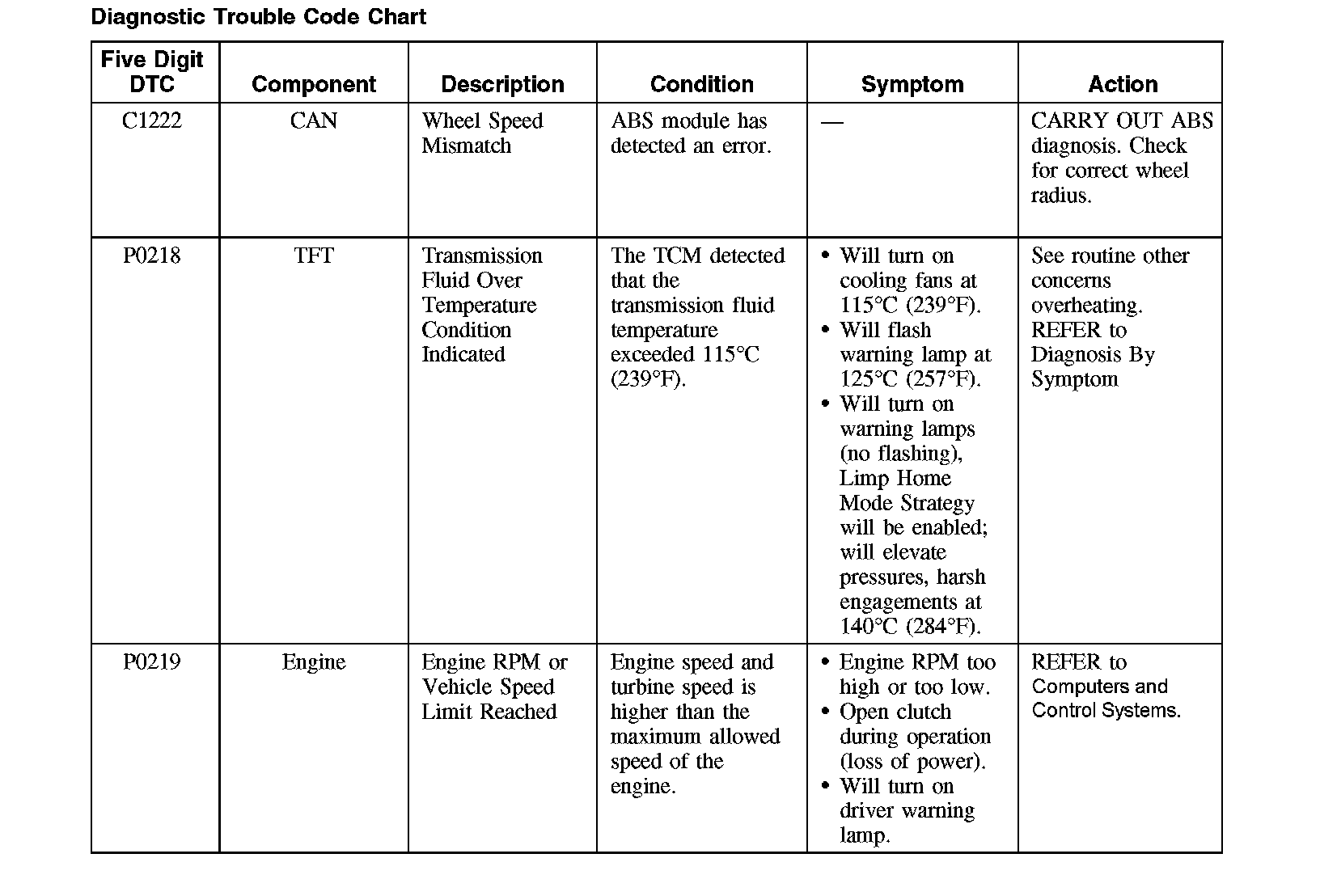 Diagnostic Trouble Code (DTC) ChartsSpecial Tool(s):Diagnostic Trouble Code ChartC1222 / P0218-P0219:P0562-P0604:P0605-P0613:P0615-P0657:P0658-P0701:P0702-P0715:P0716-P0730:P0740-P0742:P0743-P0845:P0868-P0900:P0902-P0903:P0942-P0960:P0961-P0963:P0964-P0966:P0967-P0968:P0970-P0971:P1710-P2637:P186D-P2766 / U0001:U0073-U0121:U0301-U0415:
