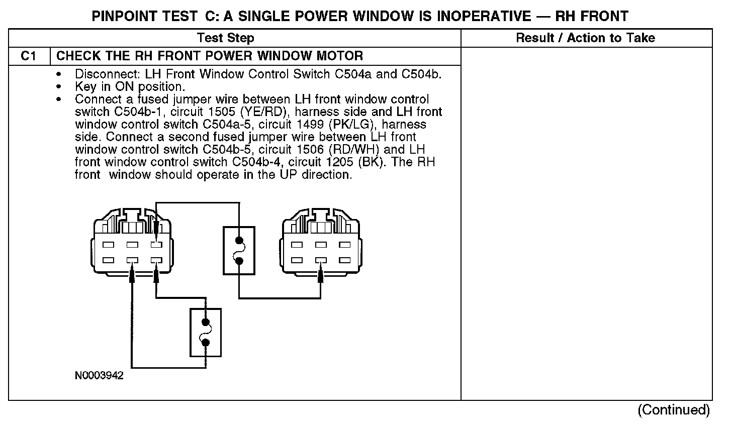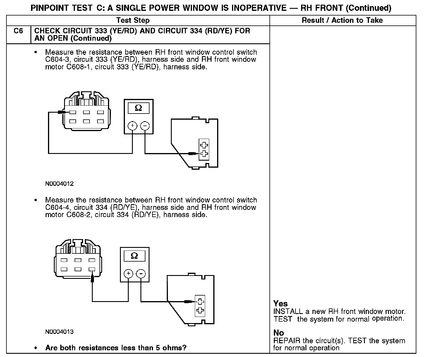 When the RH front window control switch is pressed to the up position, the RH front window control switch receives ground from the LH front window switch through circuit 1506 (RD/WH). When operating the RH front window in the up direction, the RH front window control switch provides power to the RH front window motor through circuit 334 (RD/YE) and ground through circuit 333 (YE/RD).
