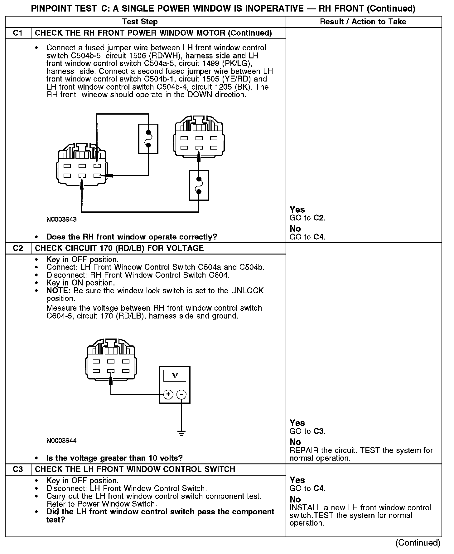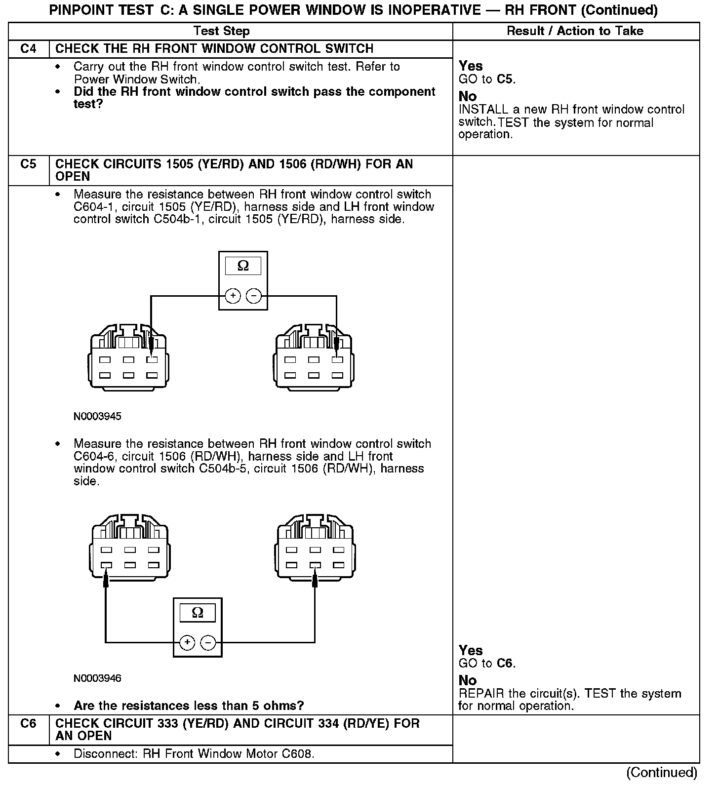 When the RH front power window is operated in the up direction from the LH front window control switch, power is sent to the RH front window control switch through circuit 1505 (YE/RD), which transfers power to the RH front window motor through circuit 334 (RD/YE). Ground is provided to the RH front window switch through circuit 1506 (RD/WH), which transfers ground to the RH front window motor through circuit 333 (YE/RD).