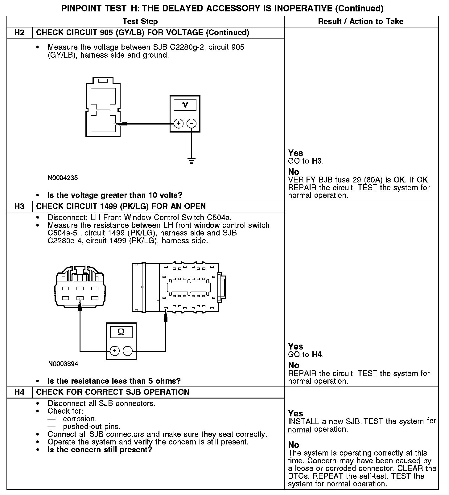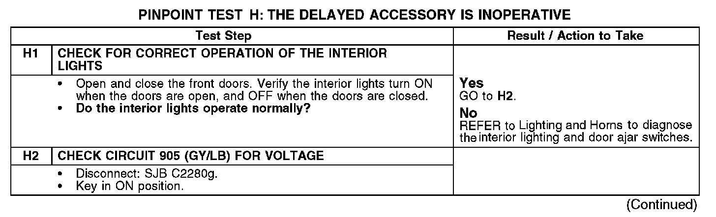 The delayed accessory relay, which is integral to the smart junction box (SJB), receives power from the central junction box (CJB) through circuit 905 (GY/LB). When the ignition key is turned ON, the SJB activates the delayed accessory relay, which provides power to the LH front window control switch through circuit 1499 (PK/LG). The delayed accessory feature remains active for 10 minutes after the ignition key is turned OFF or until either front door is opened.