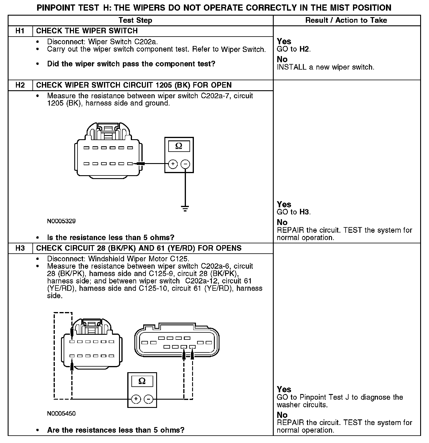 Under normal operation, the wiper switch receives ground through circuit 1205 (BK). The windshield wiper motor receives input from the wiper switch through circuits 28 (BK/PK) and 61 (YE/RD) to operate the MIST wiper function.