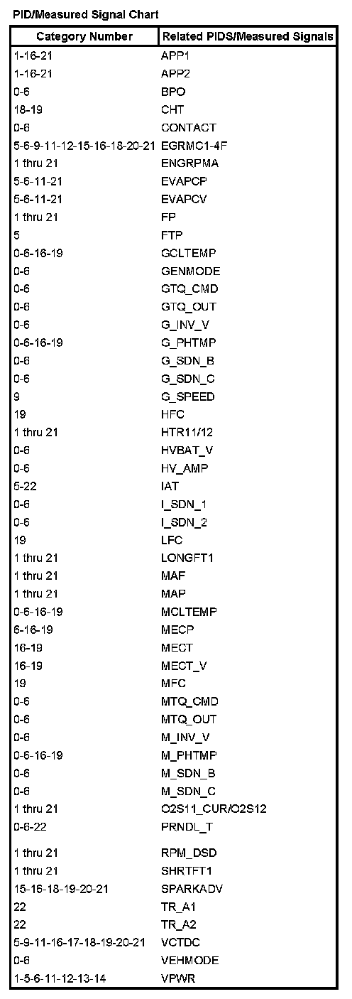 The listing reflects PIDS and/or measured values which may reveal a possible concern within each system shown. Match the category number with the related PID/measured signal and go to the Typical Diagnostic Reference Value Charts. Typical Diagnostic Reference Values