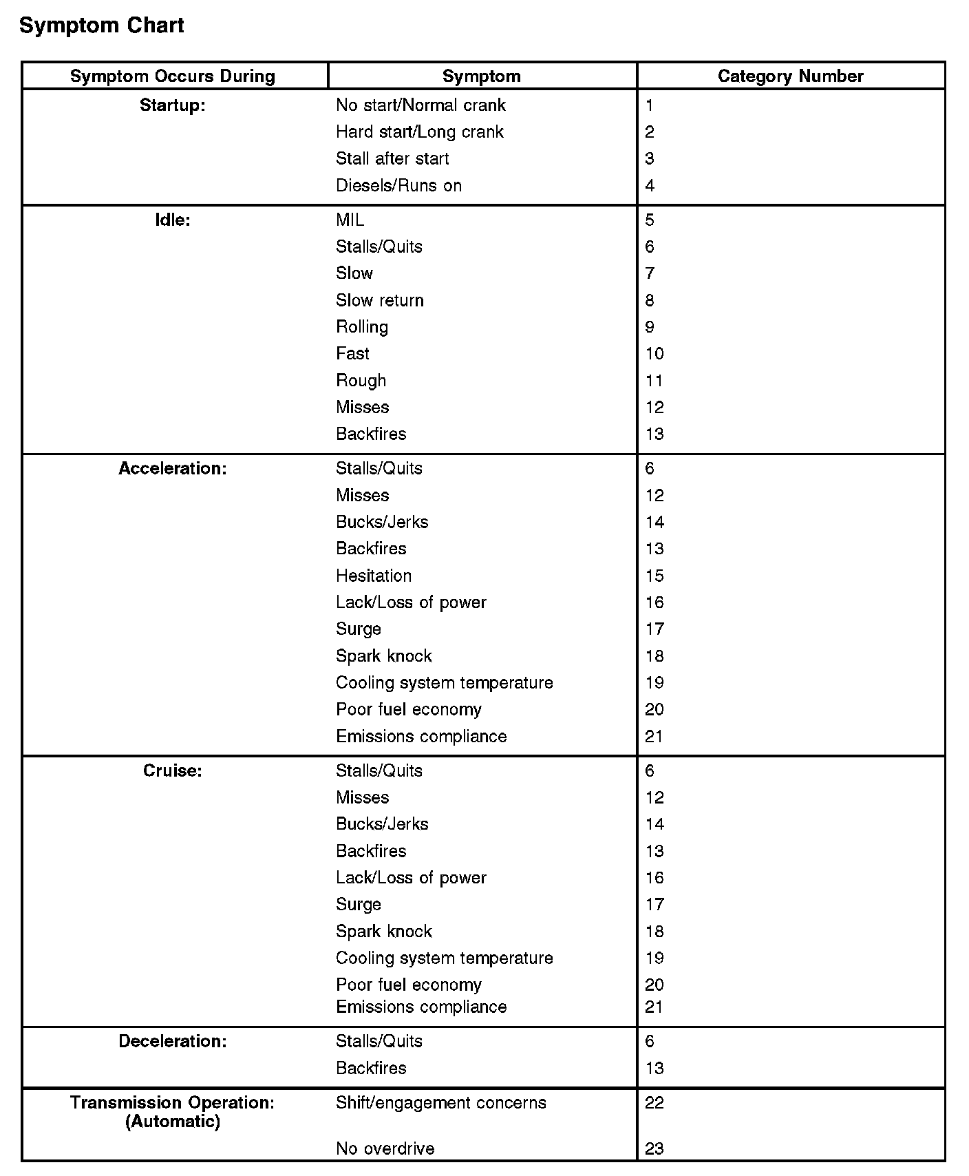 The Reference Value Symptom Chart provides guidance in selecting the appropriate parameter identification (PID) or measured signal related to the fault area. Select a symptom from the symptom chart along with the category number and go to the PID/Measured Signal Chart. For multiple symptoms, select the symptom that is the most evident. Reference Value Parameter Identification (PID)/Measured Signal Chart