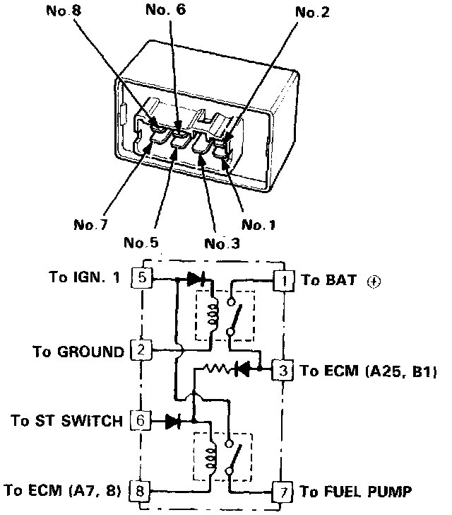 2. Attach the Battery Positive Terminal to the No. 6 Terminal and the Battery Negative Terminal to the No. 8 Terminal of the PGM-FI Main Relay. Then check for continuity between the No. 5 Terminal and No. 7 Terminal of the PGM-FI Main Relay.