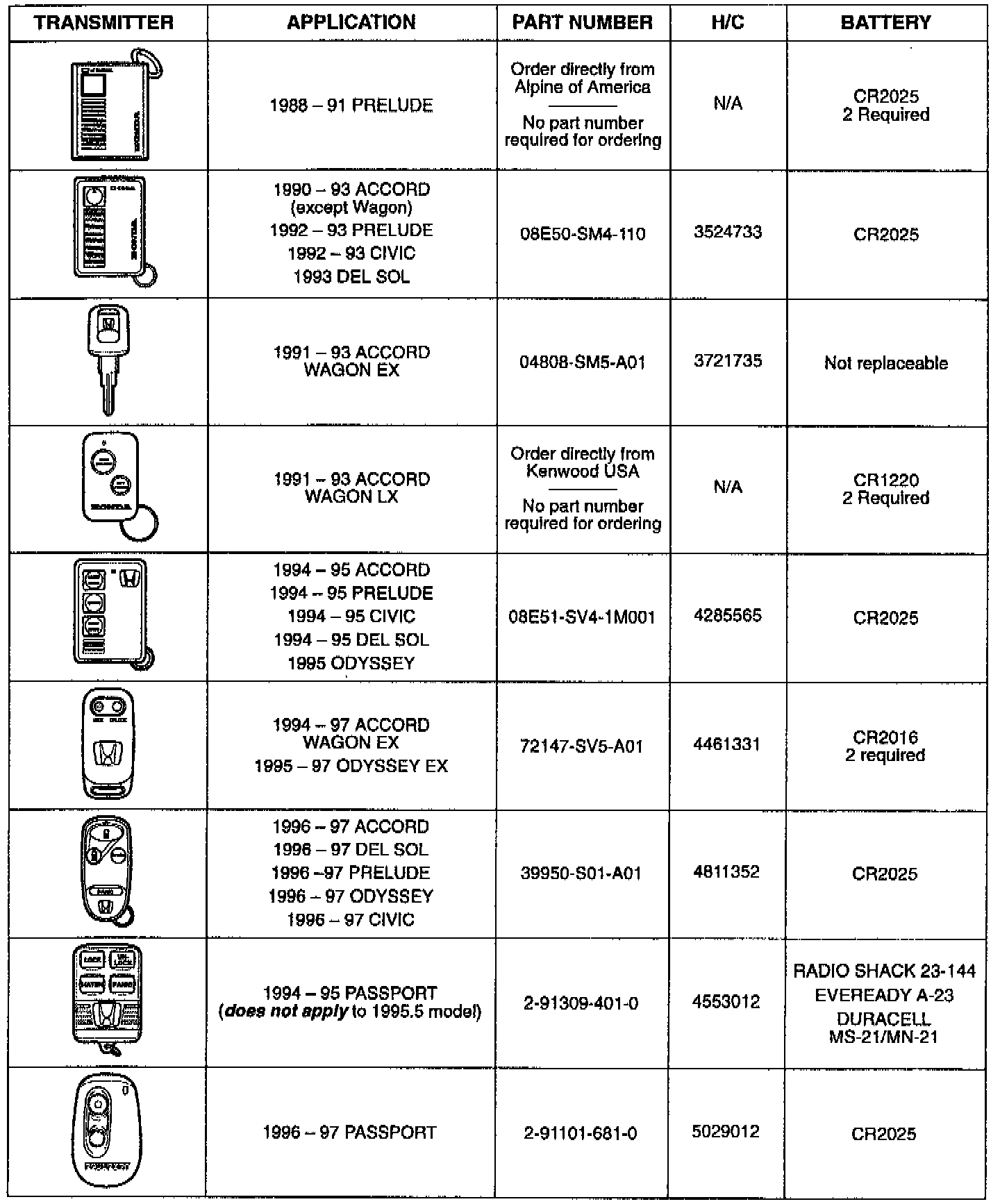 This Service Bulletin gives you information about keyless remote transmitters for most Honda vehicles. Each procedure describes transmitter programming (if applicable), transmitter ordering*, and transmitter batteries. A transmitter quick reference guide is included.
