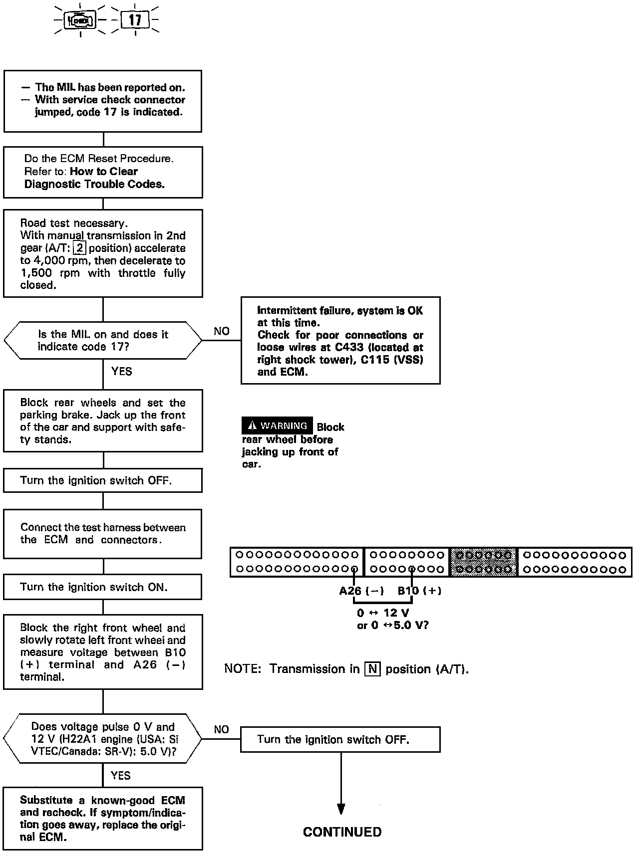 The Malfunction Indicator Lamp (MIL) indicates Diagnostic Trouble Code (DTC) 17 - A problem in the Vehicle Speed Sensor (VSS) circuit.