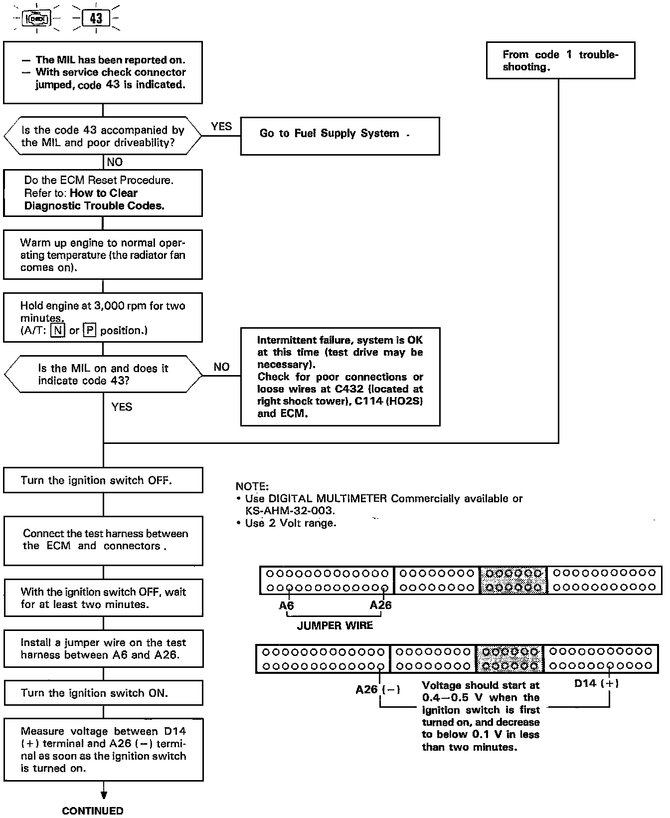 The Malfunction Indicator Lamp (MIL) indicates Diagnostic Trouble Code (DTC) 43 - A problem in the Heated Oxygen Sensor (HO2S) circuit, or a problem in the Fuel Supply System.