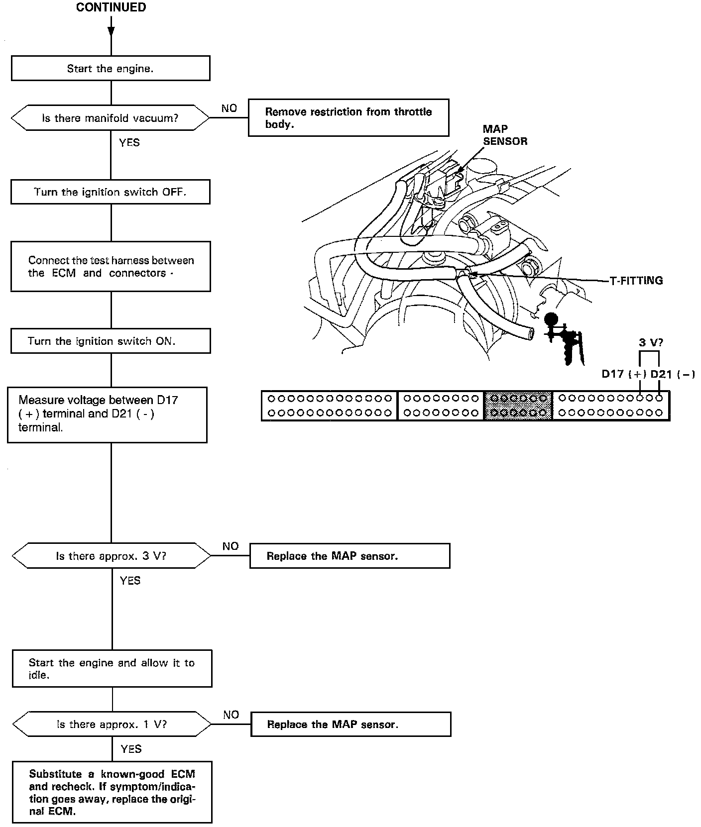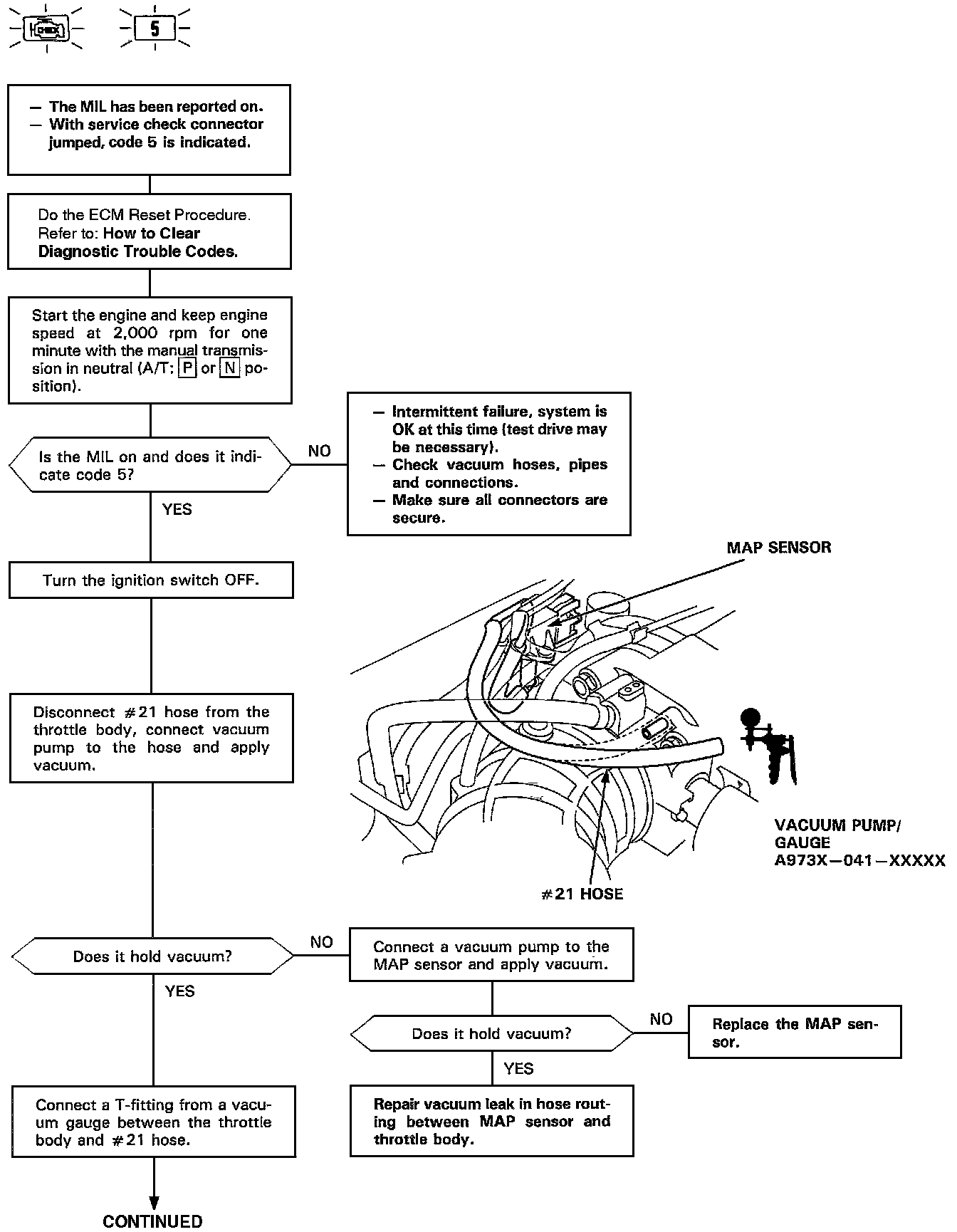 The Malfunction Indicator Lamp (MIL) indicates Diagnostic Trouble Code (DTC) 5 - A mechanical problem (vacuum leak) in the Manifold Absolute Pressure (MAP) Sensor system.