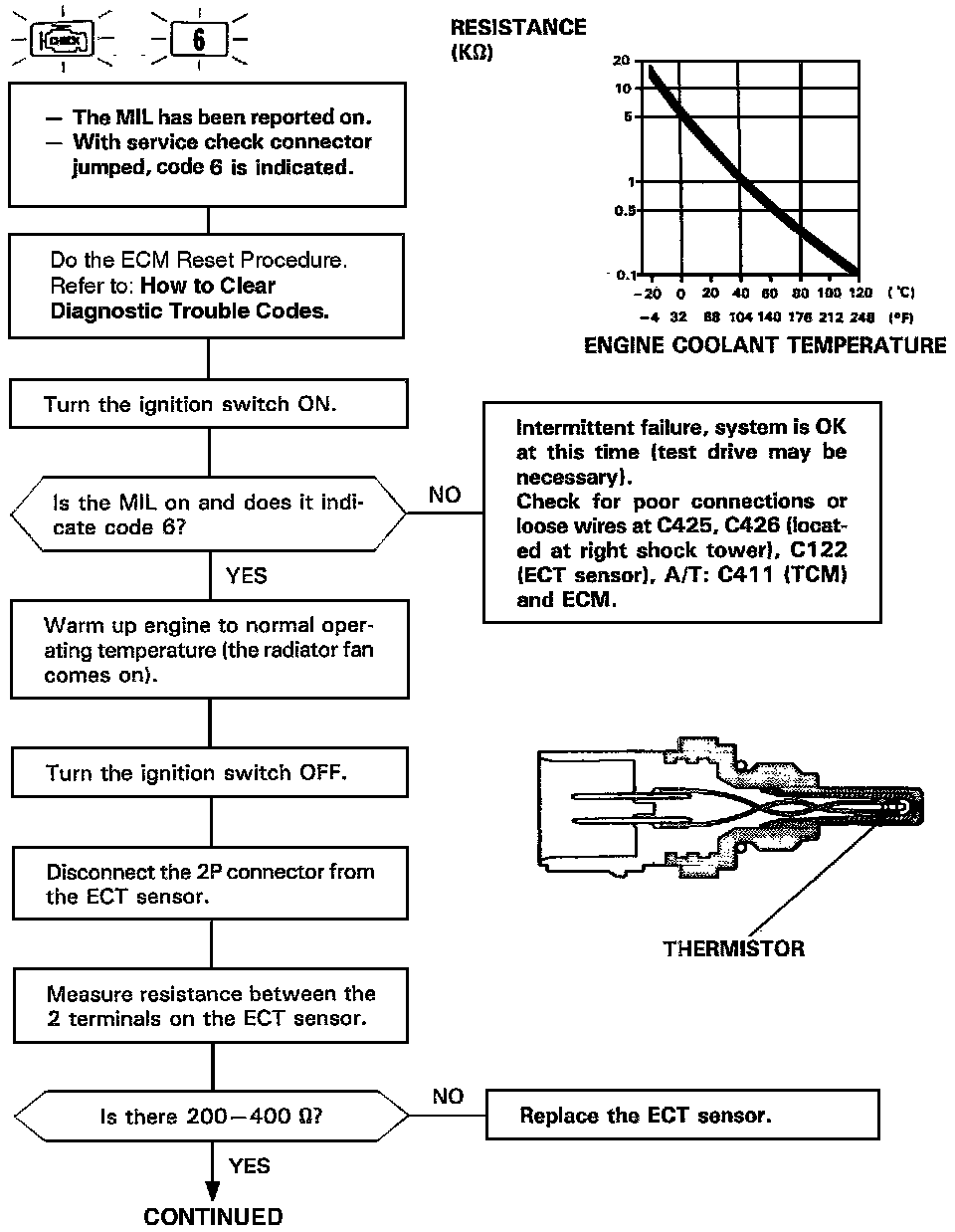 The Malfunction Indicator Lamp (MIL) indicates Diagnostic Trouble Code (DTC) 6 - A problem in the Engine Coolant Temperature (ECT) Sensor circuit.