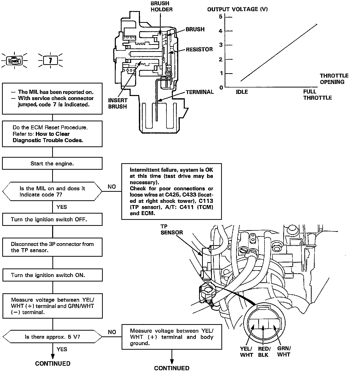 The Malfunction Indicator Lamp (MIL) indicates Diagnostic Trouble Code (DTC) 7 - A problem in the Throttle Position (TP) Sensor circuit.