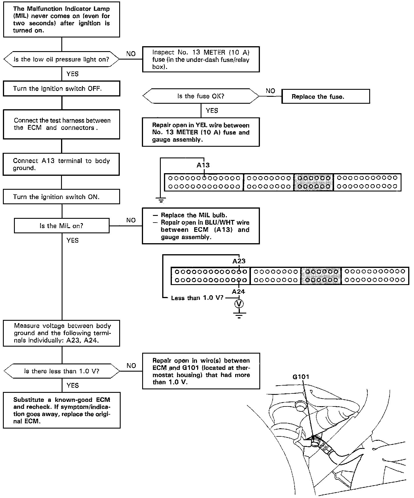NOTE: When there is no code stored, the Malfunction Indicator Lamp (MIL) will stay on if the Service Check Connector is shorted and the Ignition Switch is on.