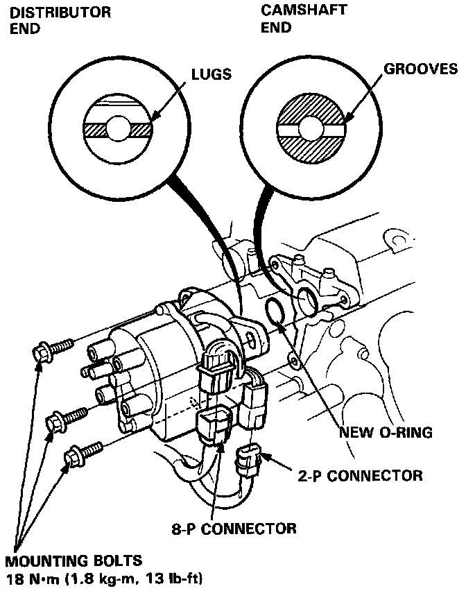 NOTE: The Lugs on the end of the Distributor and their mating grooves in the Camshaft end are both offset to eliminate the possibility of installing the Distributor 180° out of time.