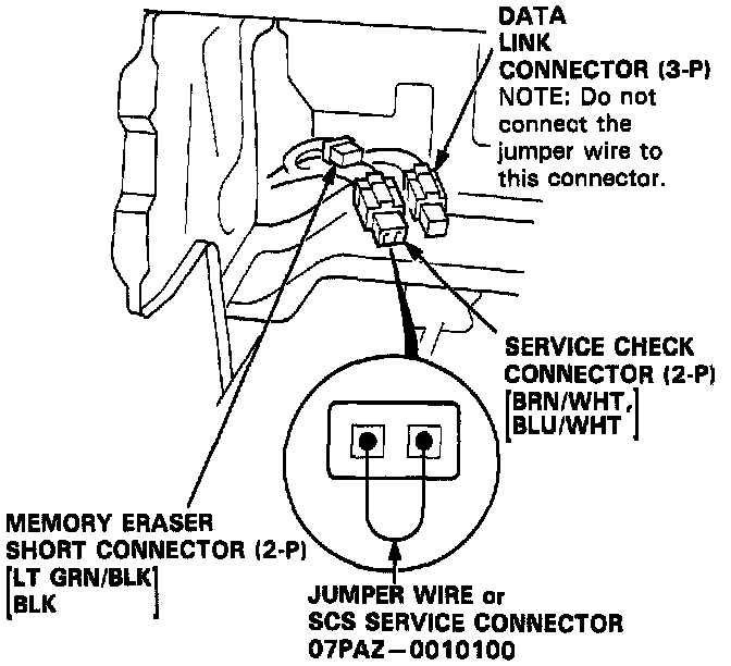 2. Pull out the Service Check Connector located behind the Glove Box. Connect the GRN/BLU and RED Terminals with the SCS Service Connector.