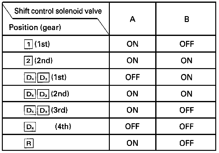 The combination of driving signals to shift control solenoid valves A and B is shown in the table.