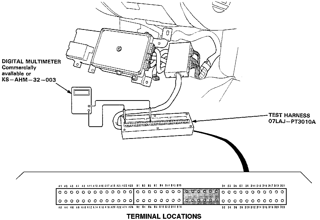 If the inspection for a particular code requires the Test Harness, remove the right door sill molding and the small cover on the right kick panel and pull the carpet back to expose the ECM. Unbolt the ECM cover. Turn the Ignition Switch off and connect the Test Harness.