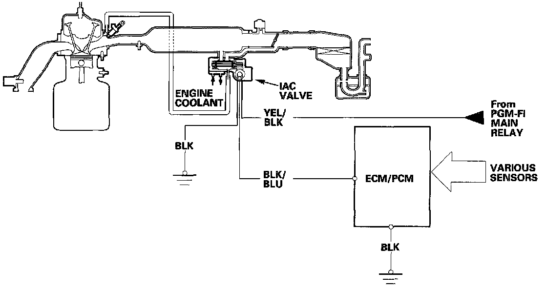 When the engine is cold, the A/C compressor is on, the transmission is in gear, the brake pedal is pressed, the P/S load is high, or the alternator is charging, the ECM/PCM controls current to the IAC valve to maintain the correct idle speed. Refer to the System Diagram to see the functional layout of the system.