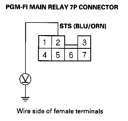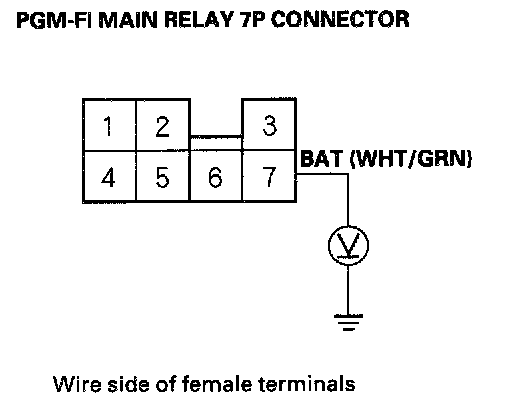 7. Push the clutch pedal in, or shift to Park, then turn the ignition switch to the START (III) position, and measure voltage between body ground and PGM-FI main relay 7P connector terminal No.2.