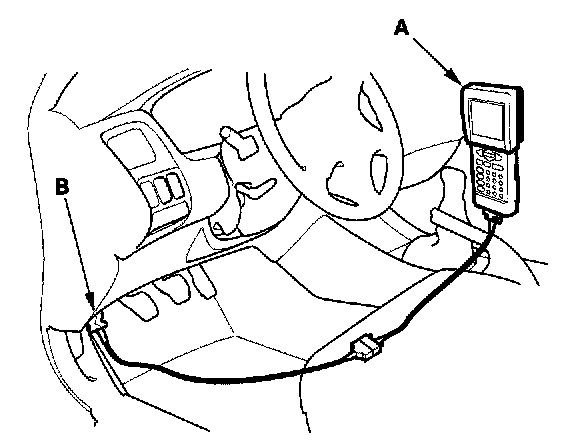 2. If the MIL stays on, connect the Honda PGM Tester (A) or an OBD II scan tool to the Data Link Connector (DLC) (B) located under the driver's side of the dashboard.