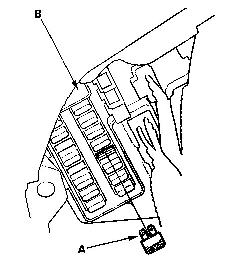 - Turn the ignition switch OFF, and remove the No.13 CLOCK BACKUP fuse (7.5 A) (A) from the passenger's under-dash fuse/relay box (B) for 10 seconds.