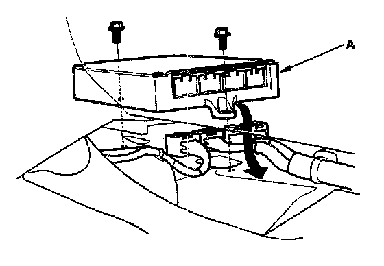 2. Remove the two bolts (4 cylinder model), or three bolts (V6 model) from the ECM/PCM (A).