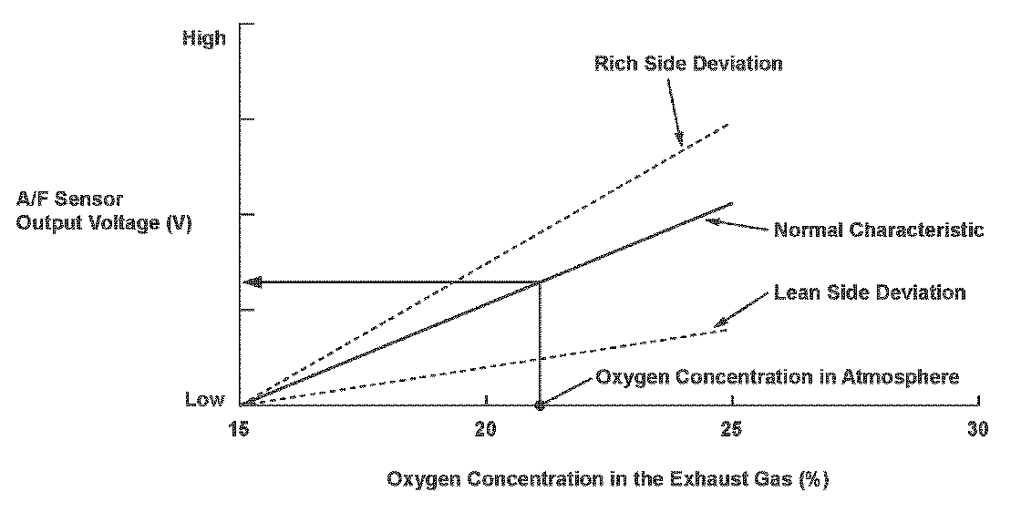 Note: Output to the scan tool exhibits a relationship between the A/F sensor output and oxygen concentration, which is opposite to the characteristic shown in the graph. That is, a deviation toward the rich side increases the output voltage and one toward the lean side decreases the output voltage, as the stoichiometric ratio is 0.