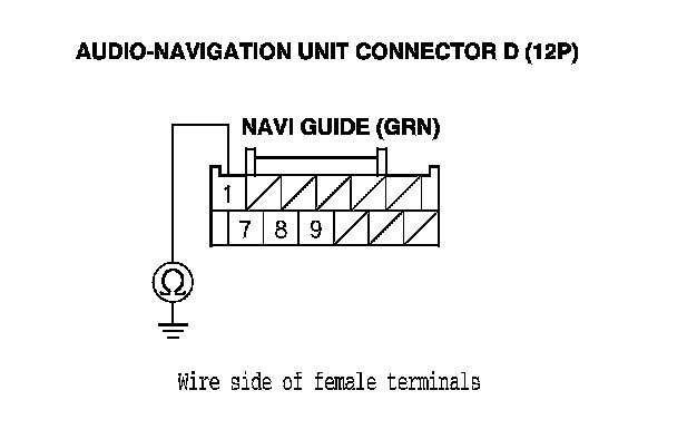 6. Check for continuity between body ground and audio-navigation unit connector D (12P) terminal No. 1.