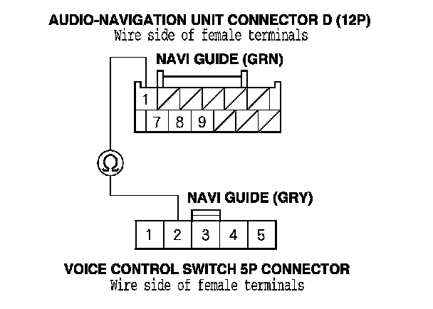 7. Check for continuity between audio-navigation unit connector D (12P) terminal No. 1 and voice control switch 5P connector terminal No. 2.