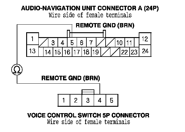 9. Check for continuity between audio-navigation unit connector A (24P) terminal No. 5 and voice control switch 5P connector terminal No. 4.