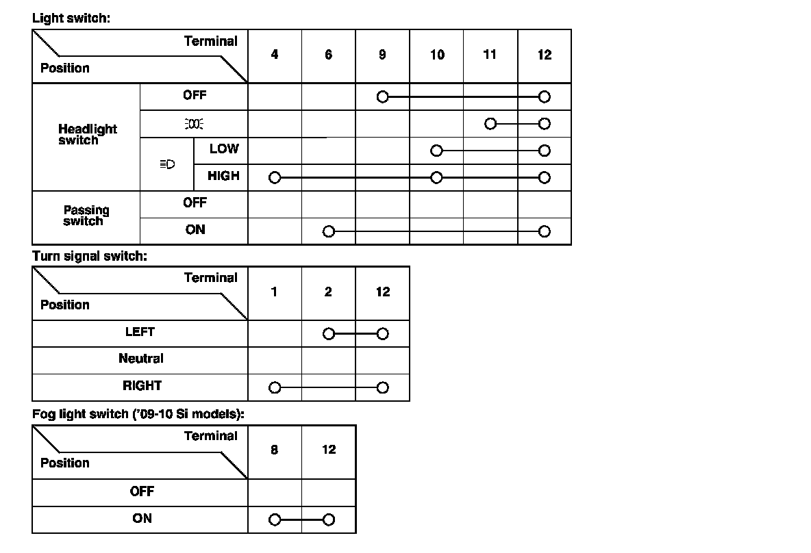 - If the terminals look OK, check for continuity between the terminals in each switch position according to the tables.