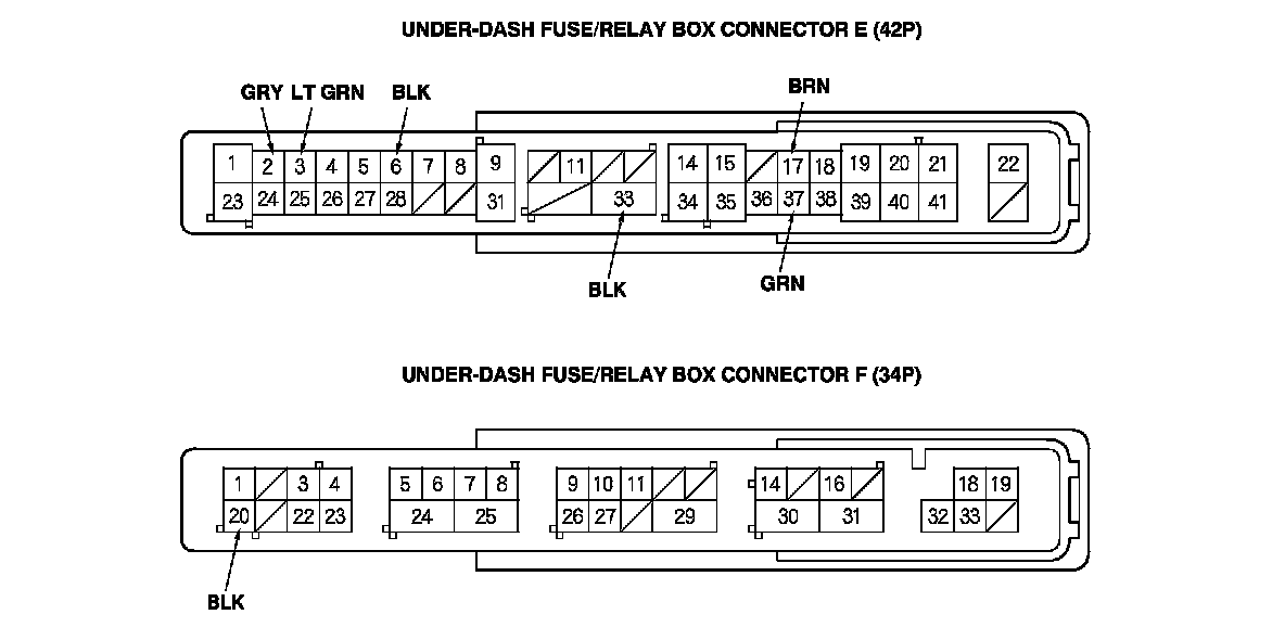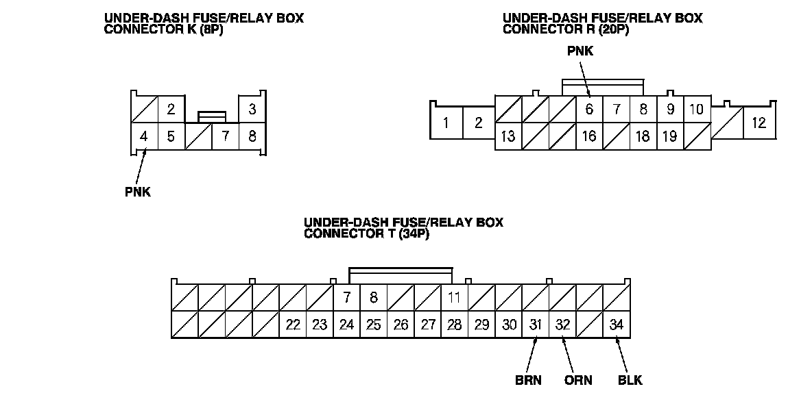2. Disconnect under-dash fuse/relay box connectors E, F, K, R, and T.