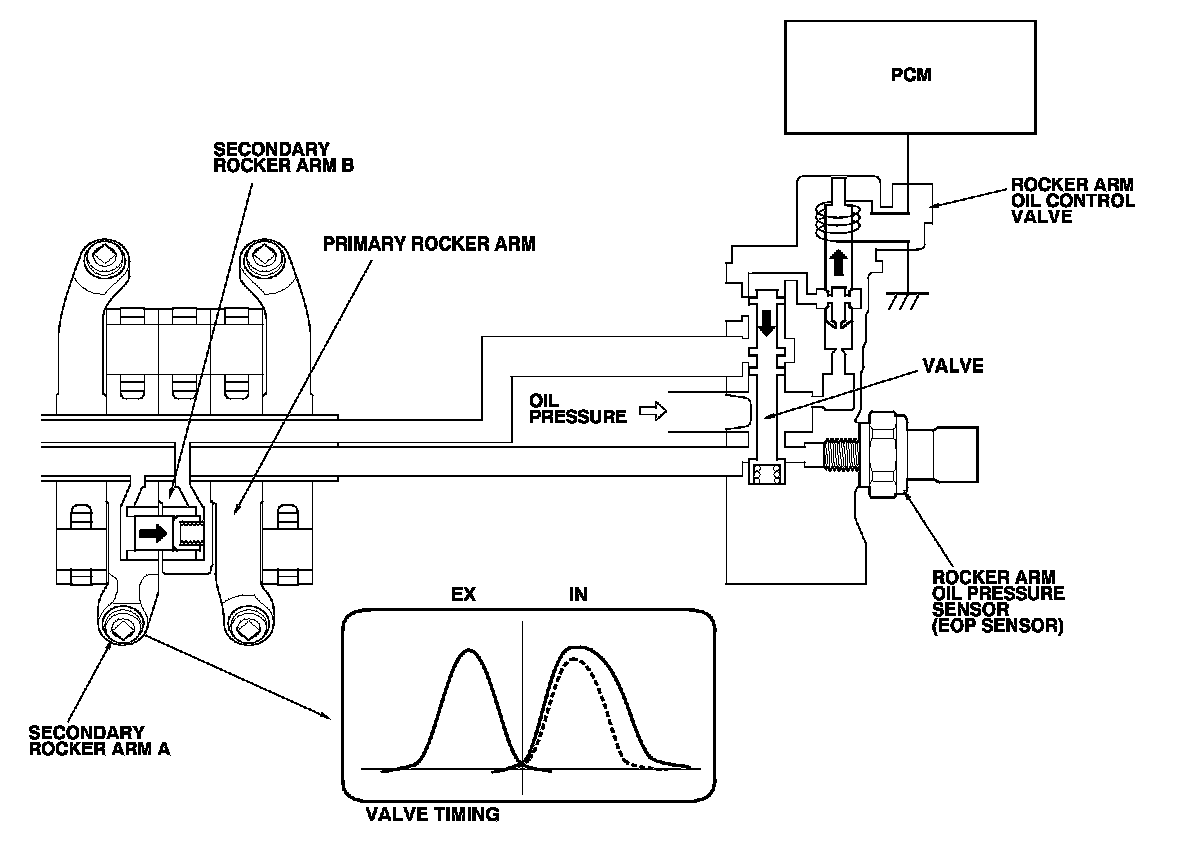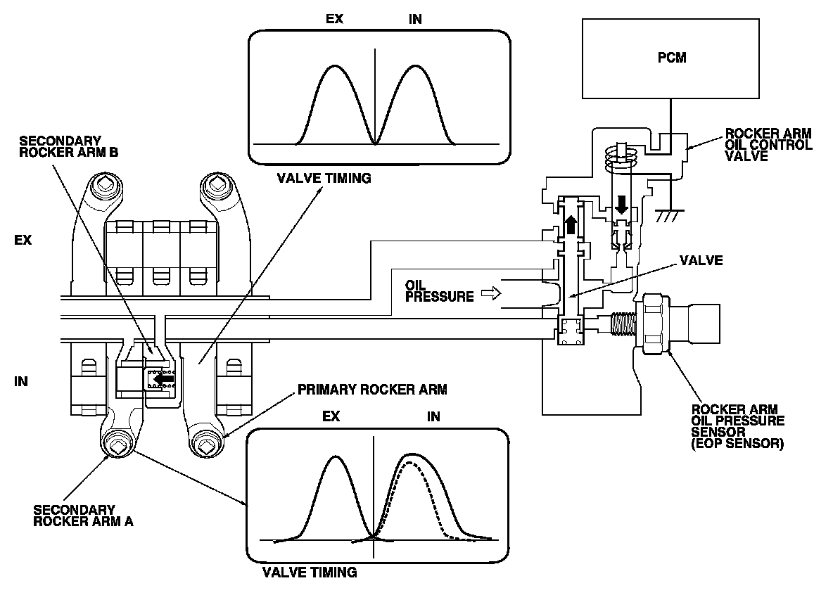 The rocker arm oil control valve switches oil pressure to the oil passage in the intake rocker arm shaft. Oil pressure then enters secondary rocker arm A, and it moves the VTEC switching piston in the rocker arm.