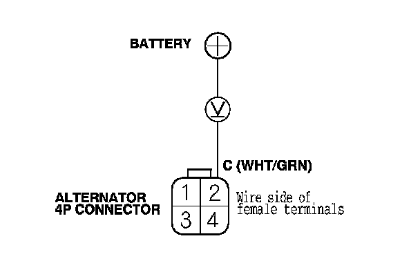 7. Measure the voltage between alternator 4P connector terminal No. 2 and the positive terminal of the battery.