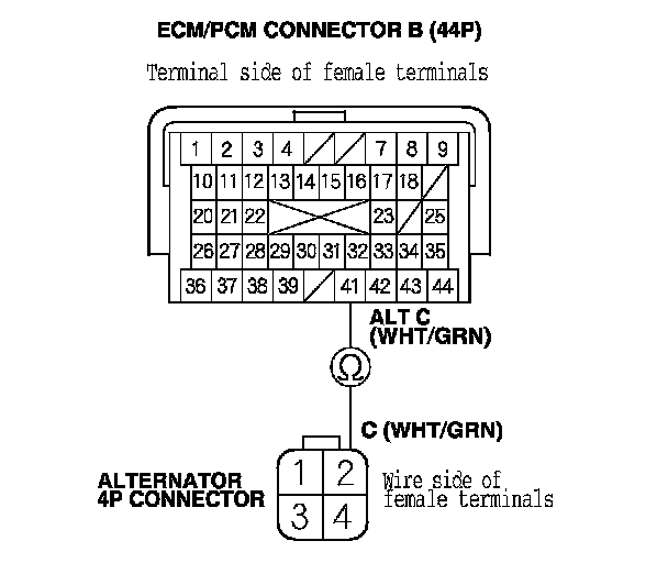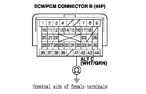 13. Check for loose terminals and connectors, then check for continuity between ECM/PCM connector terminal B41 and alternator 4P connector terminal No. 2.