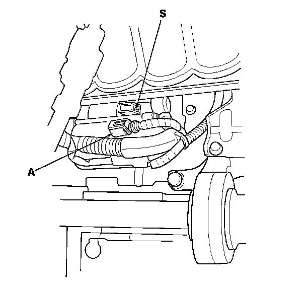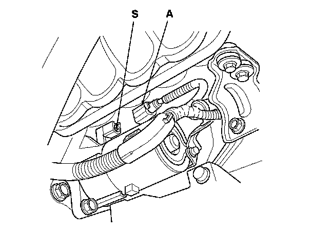 10. Make sure the shift lever is in neutral (M/T model) or N or P (A/T model), then disconnect the connector (A). Connect a jumper wire from the battery positive terminal to the S terminal connector.