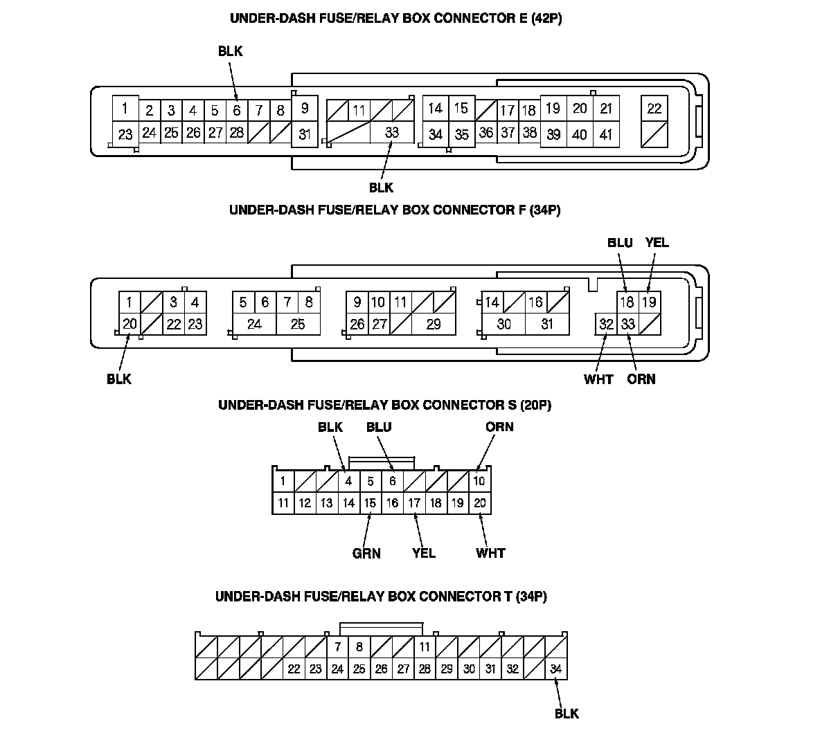 2. Disconnect under-dash fuse/relay box connectors E, F, S, and T.