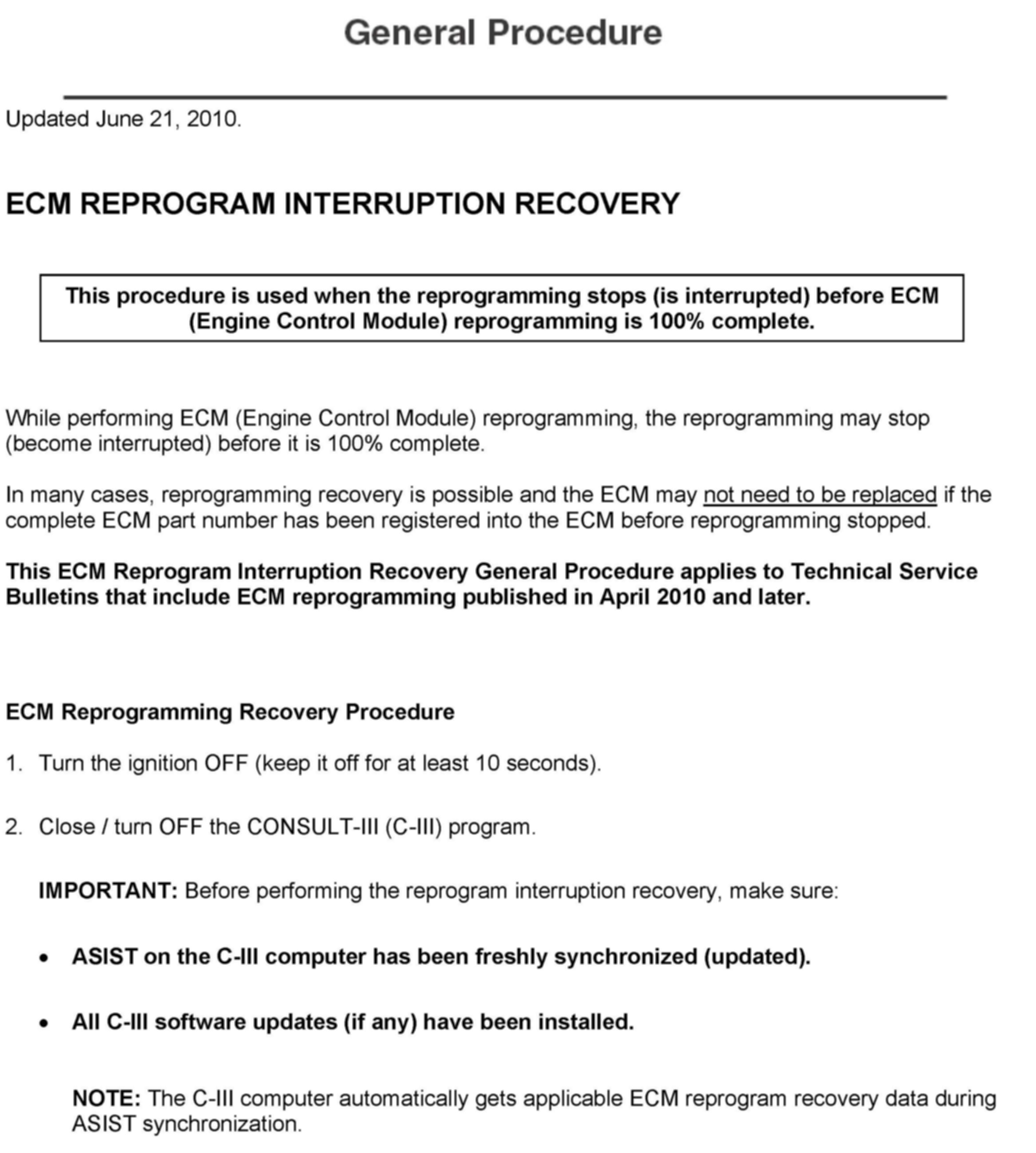 A complete step-by-step General Procedure for CONSULT-III (C-III) ECM Reprogram Interruption Recovery is now available in this bulletin as a attachment.