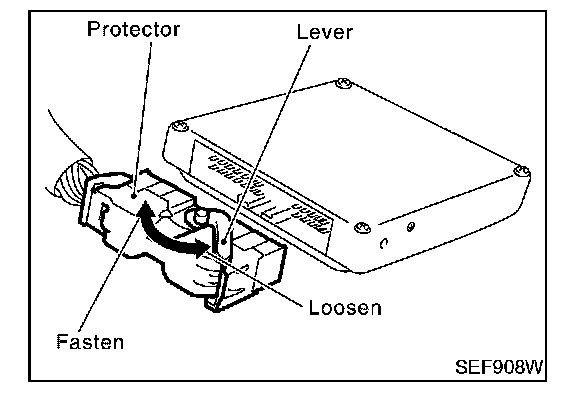 When connecting ECM harness connector, fasten it securely with a lever as far as it will go as shown.