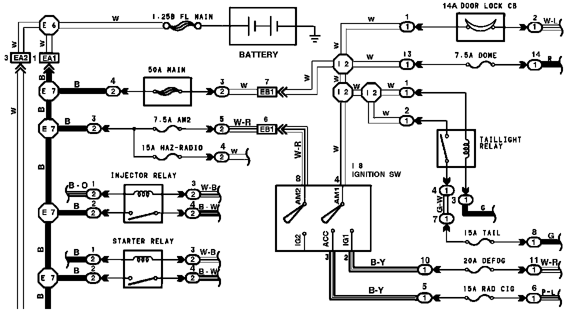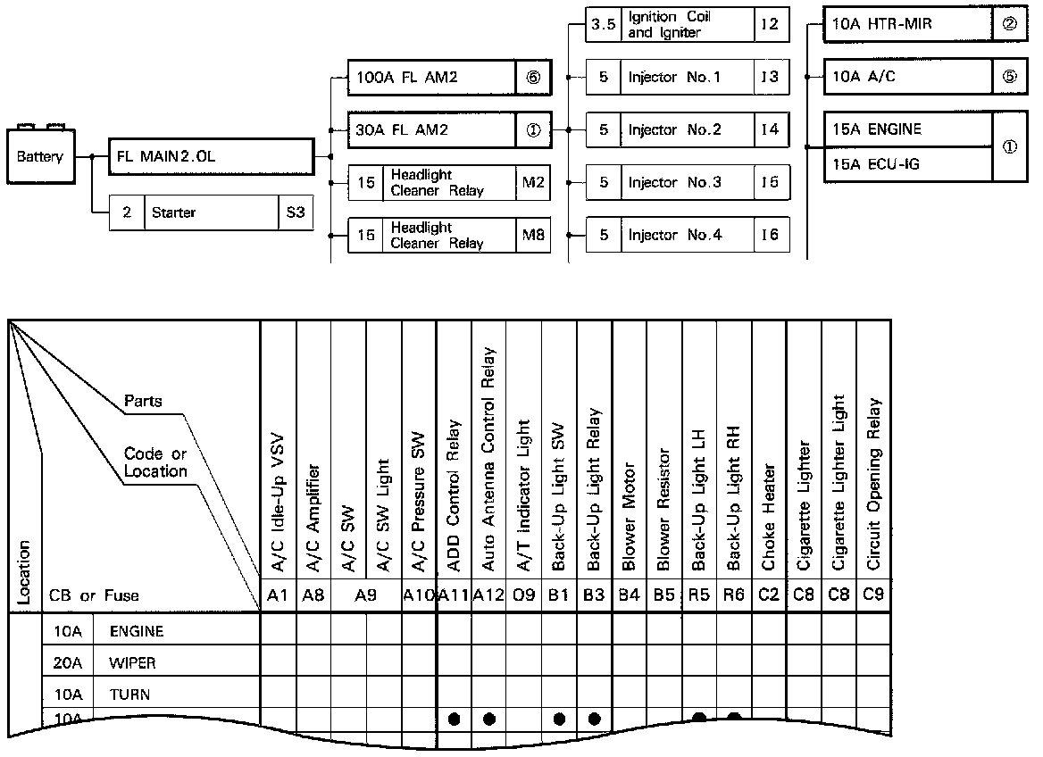 The chart below shows the route by which current flows from the battery to each electrical source (Fusible Link, Circuit Breaker, Fuse, etc.) and other parts.