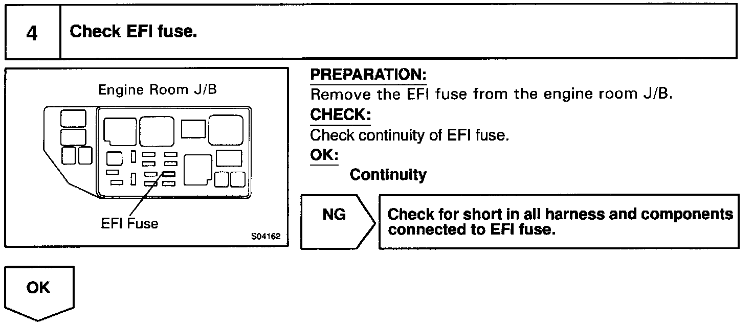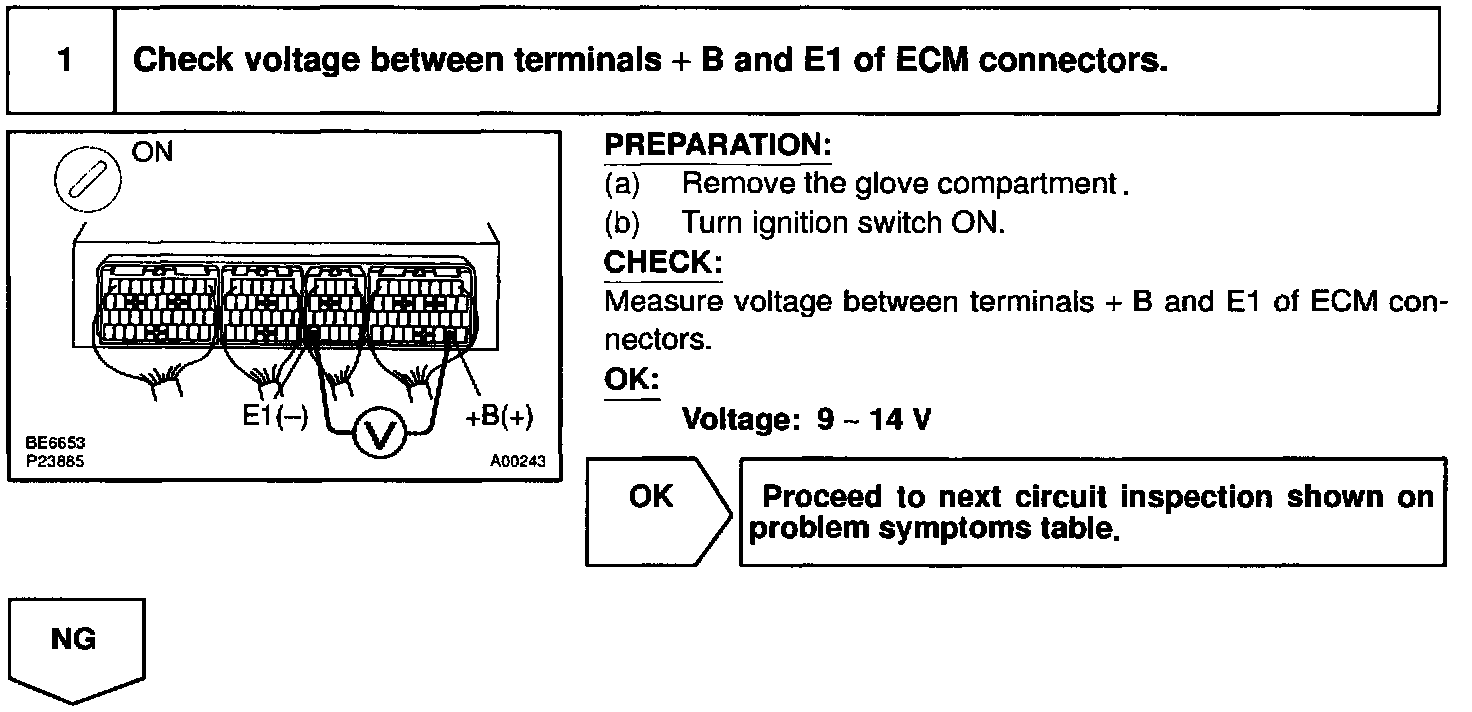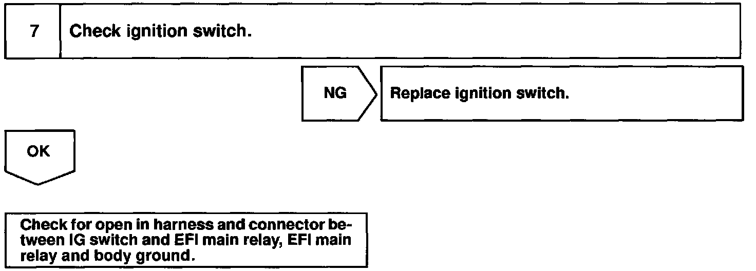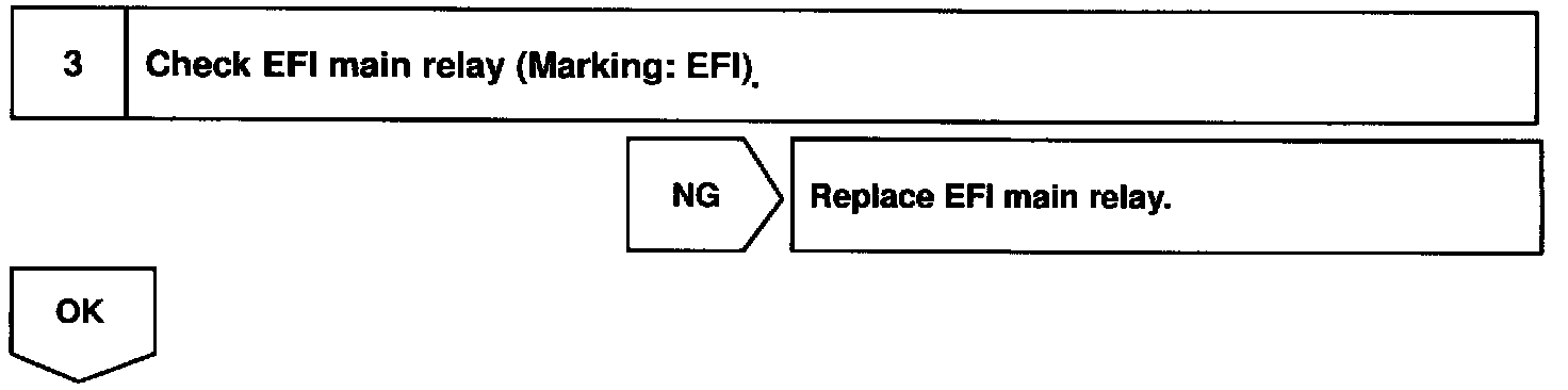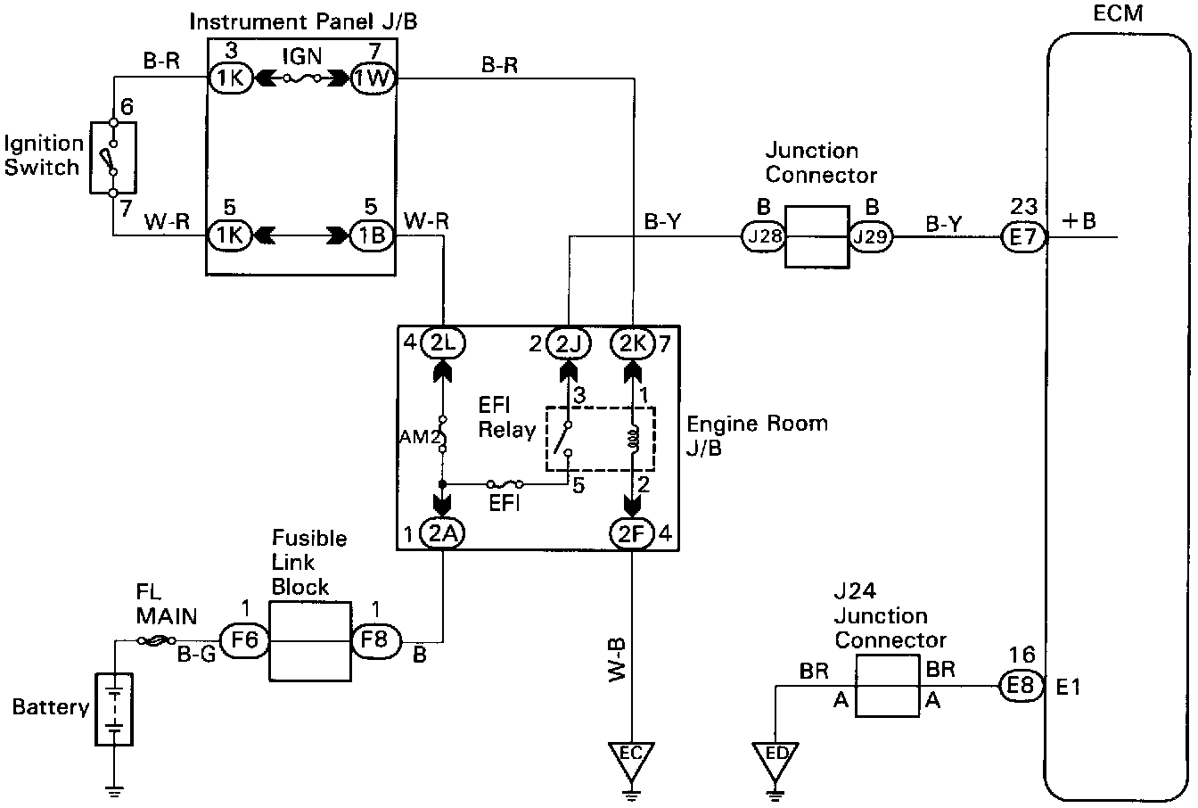 When the ignition switch is turned ON, battery positive voltage is applied to the coil, closing the contacts of the EFI main relay (Marking: EFI) and supplying power to the terminal +B of the ECM.