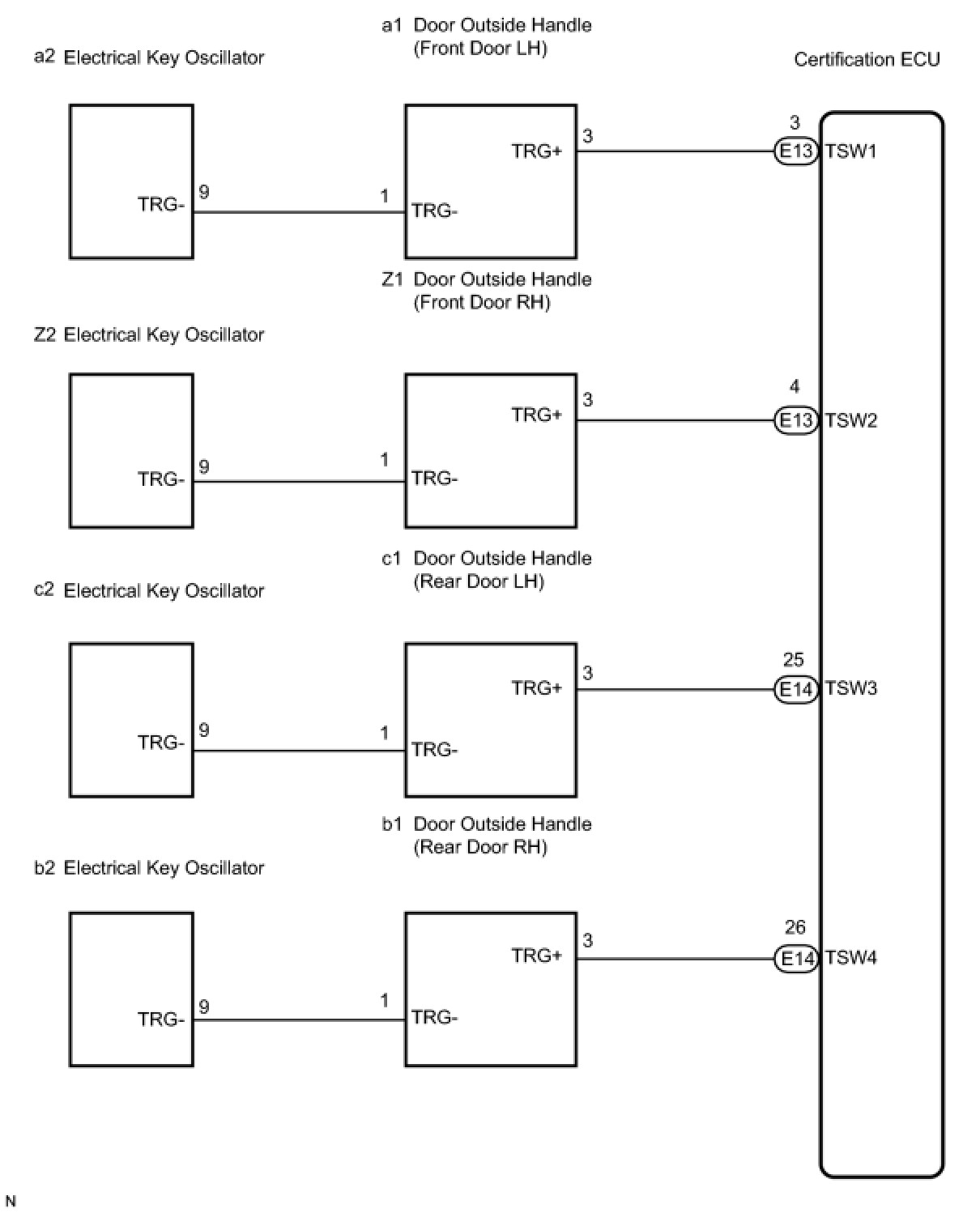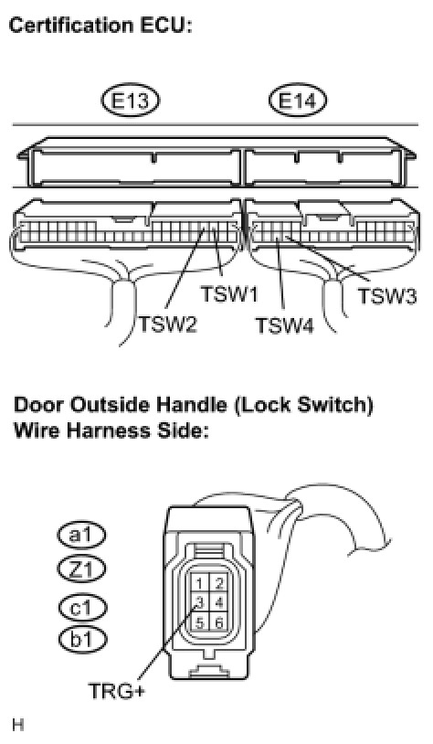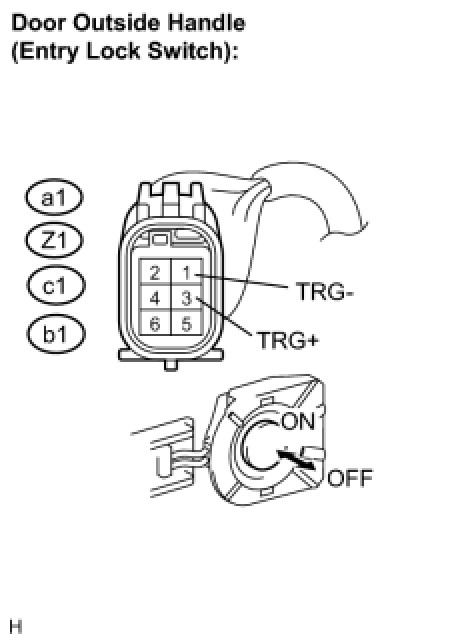 The entry lock switches (trigger switch) are built into the door outside handles of the all doors. The certification ECU detects the conditions of each lock switch.
