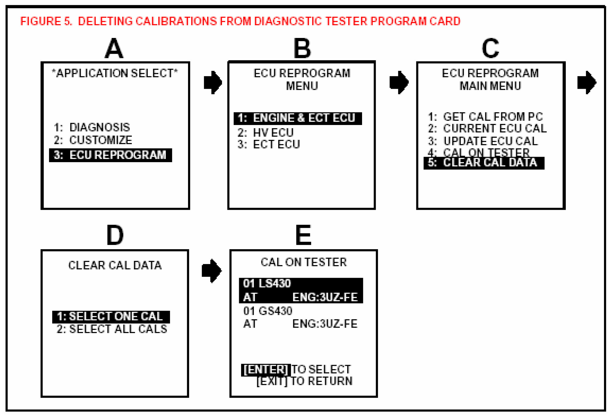 B. You have the option to delete calibrations off the tester before downloading a new calibration. The CUW also provides this option if there is not enough memory for the new calibration. To delete one or all of the calibrations, follow the screen flow (Figure 5).