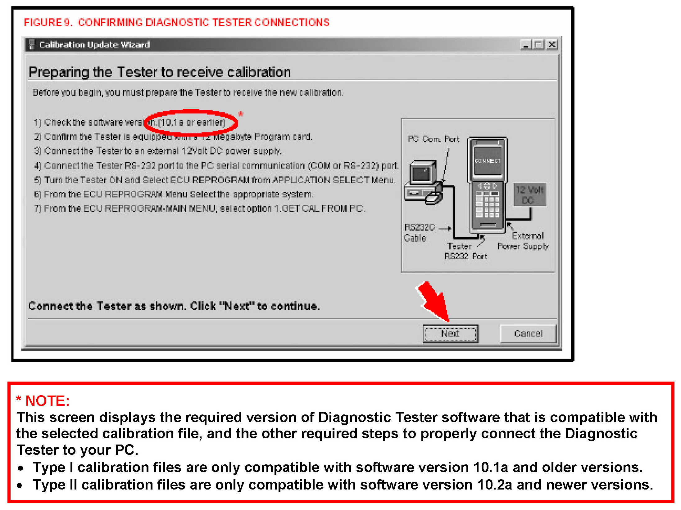 Verify that the CUW version is 6.0 or higher. If not, refer to the Note below. The CUW will guide you through the steps to download the calibration file to the Diagnostic Tester Program Card. Click NEXT on the first screen (Figure 7).