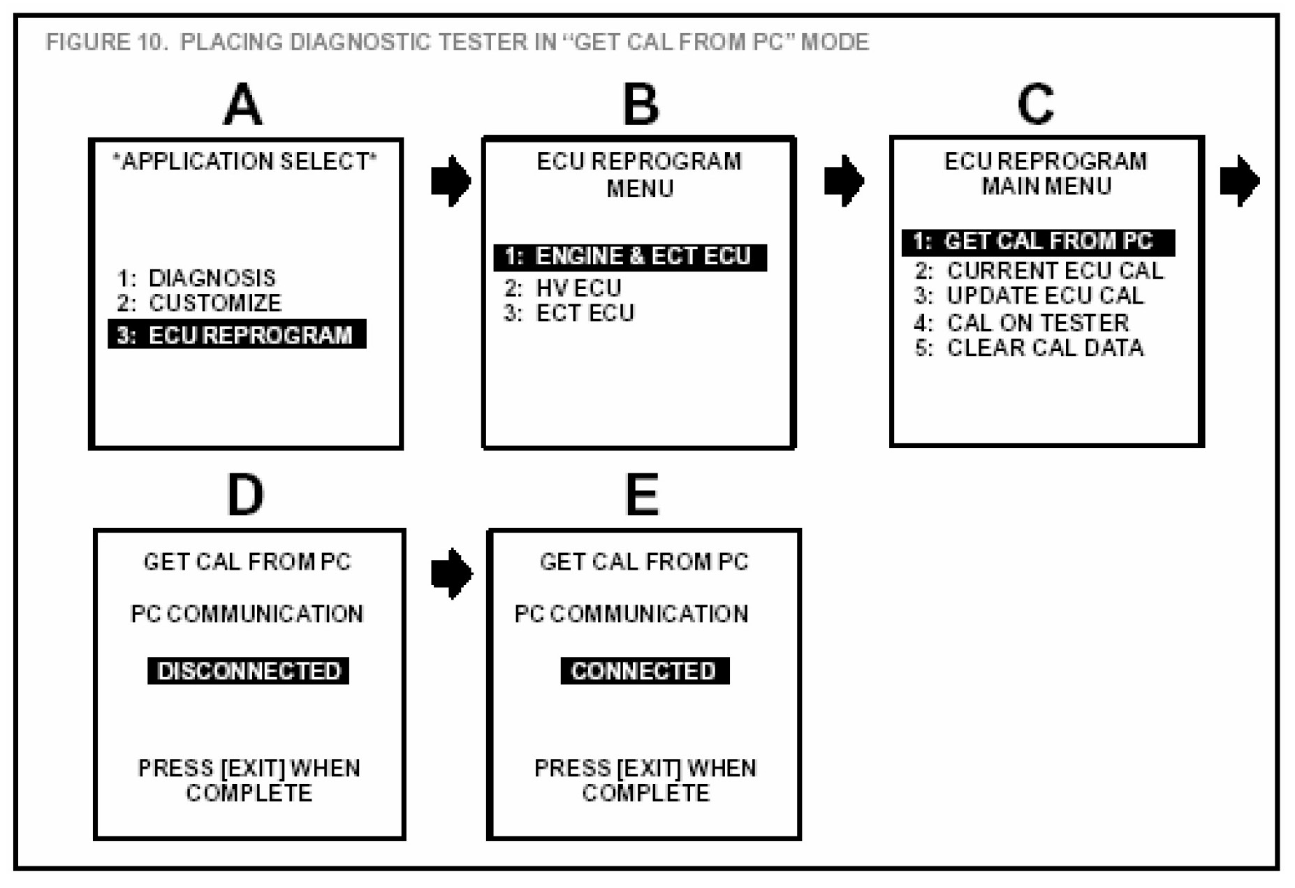 G. Place the Diagnostic Tester in the "GET CAL FROM PC" mode to receive the calibration file (Figure 10) Click NEXT on the ETAS workstation. Once communications begin between the PC and the Diagnostic Tester, the Diagnostic Tester display will flash CONNECTED.