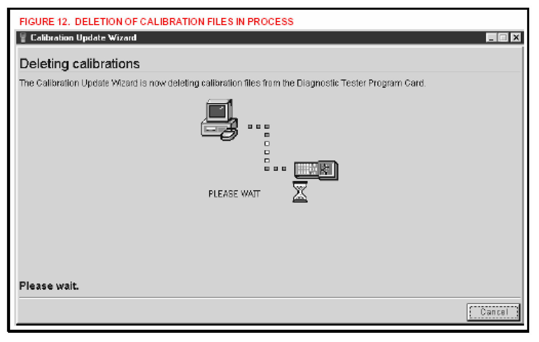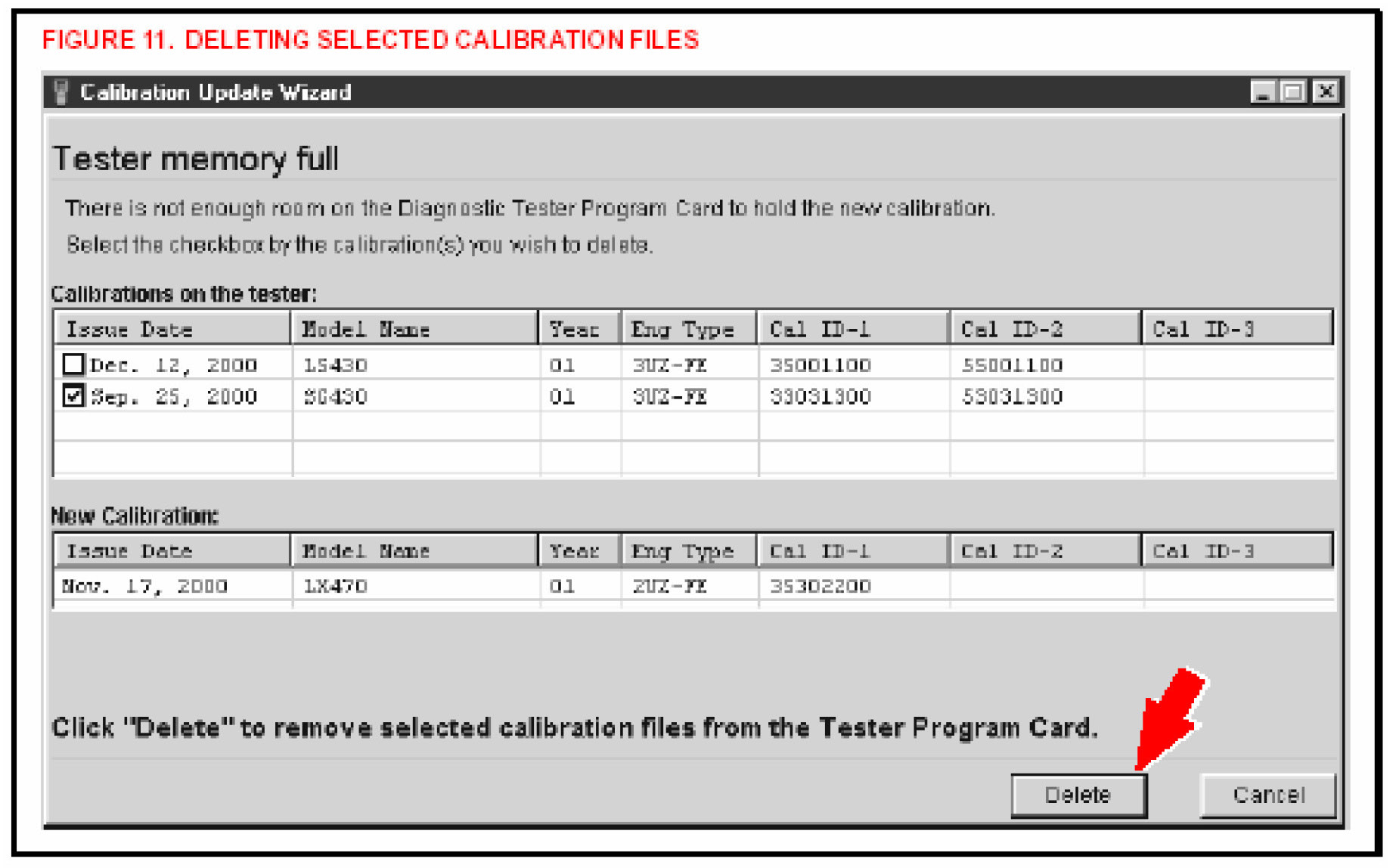 H. The CUW determines if there is enough memory to store the calibration file on the Diagnostic Tester Program Card. If there is insufficient memory, the CUW will ask you to select the calibration file(s) to delete from the Diagnostic Tester Program Card to make room for the new calibration file. If necessary, check the calibration file(s) to delete, as shown in Figure 11. Click DELETE.